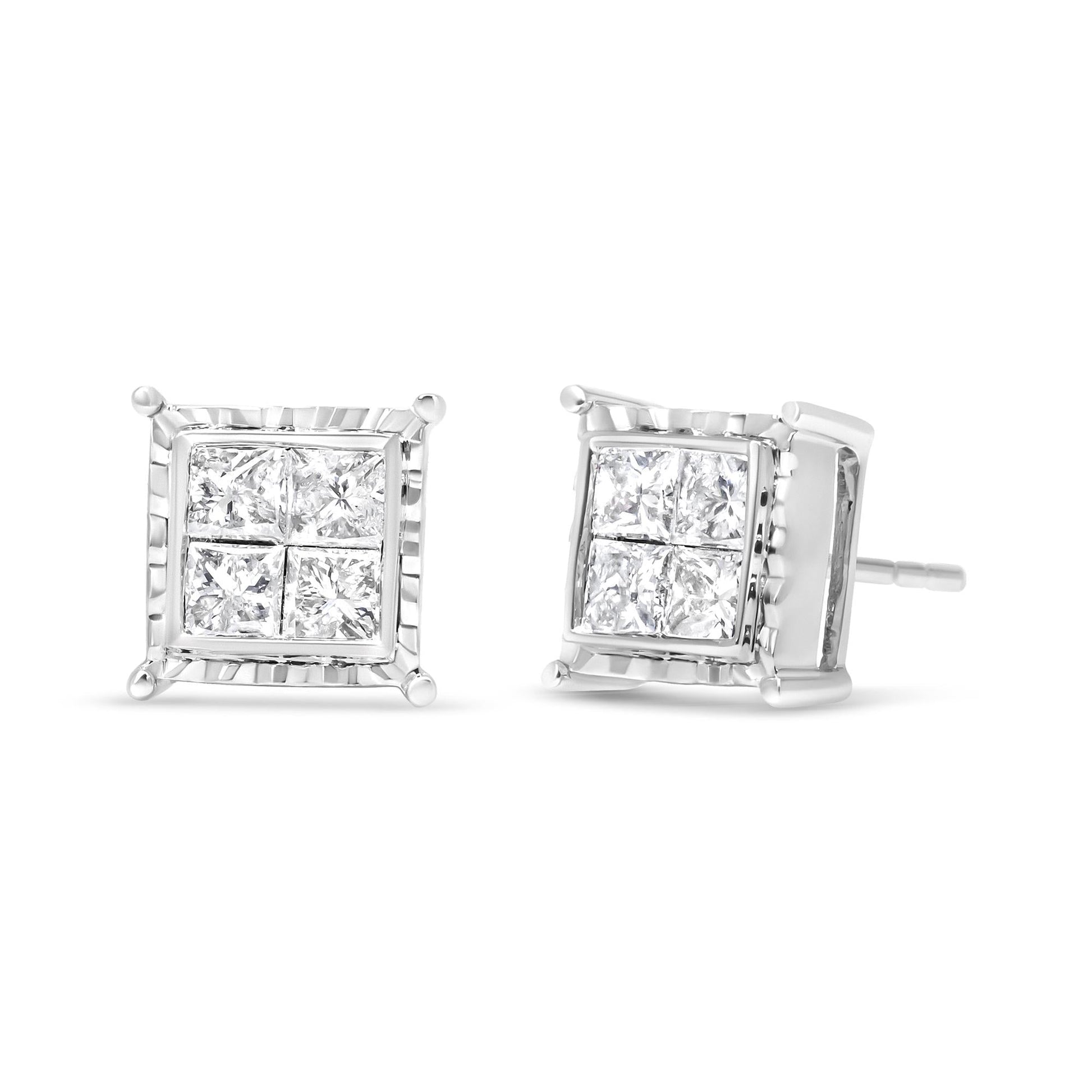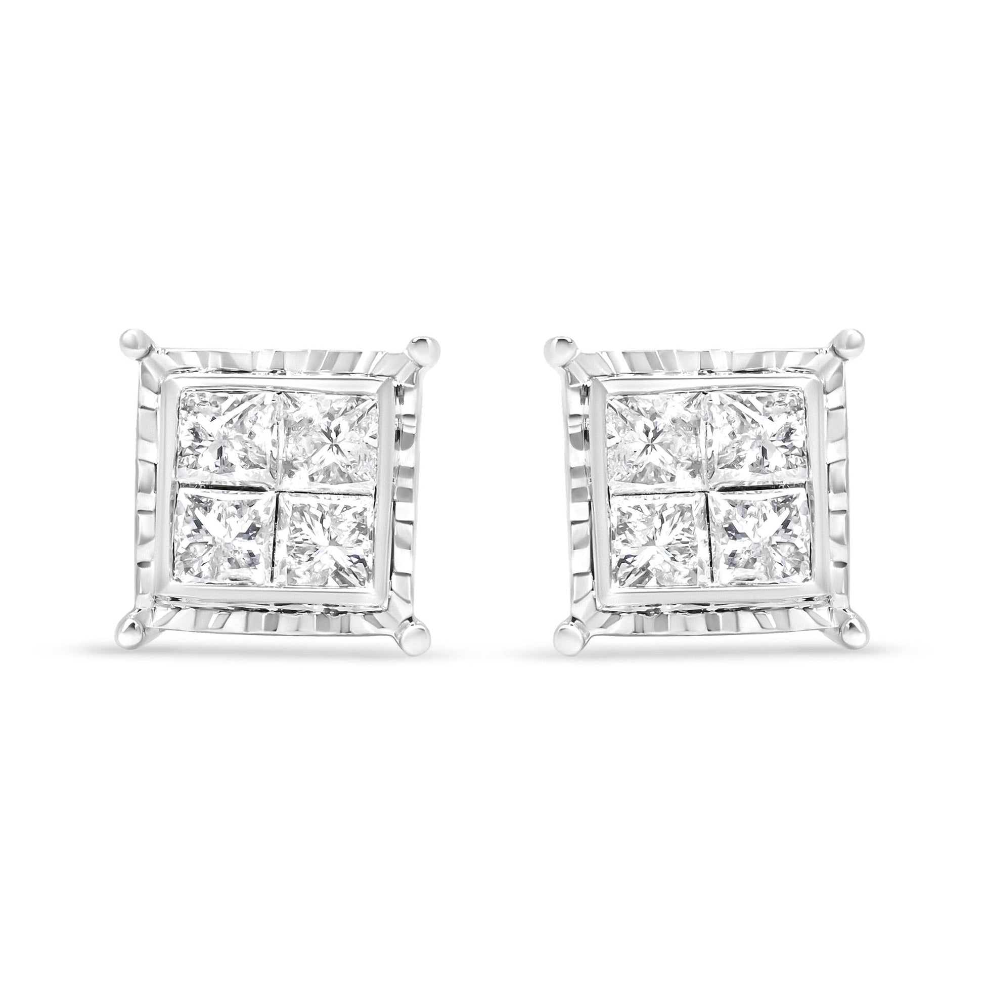 Experience the alluring sparkle of these quad stud diamond earrings. These attractive 14k white gold studs behold a striking contemporary silhouette in a geometric square shape with a wavy metalwork frame that graces your ears in modern grace. Each earring holds four princess-cut diamonds secured in a wondrous invisible setting that gives full glory to the sparkle of the stones. These captivating diamonds total 1 1/2 cttw with an approximate I-J Color and I1-I2 Clarity. This pair of pierced earrings secure with push back findings.