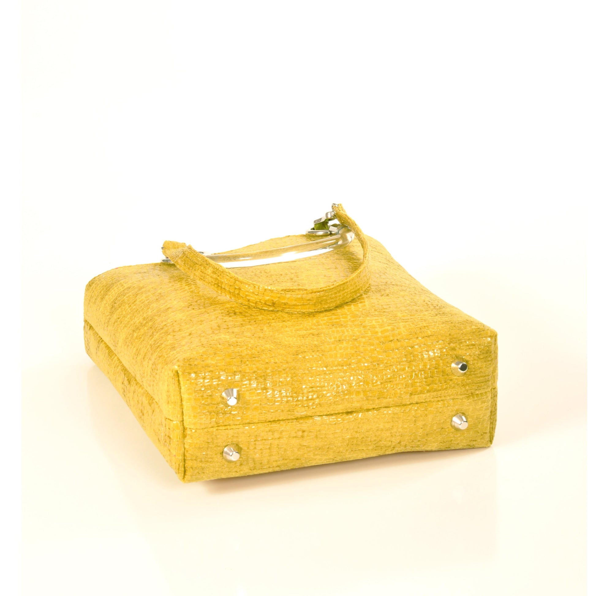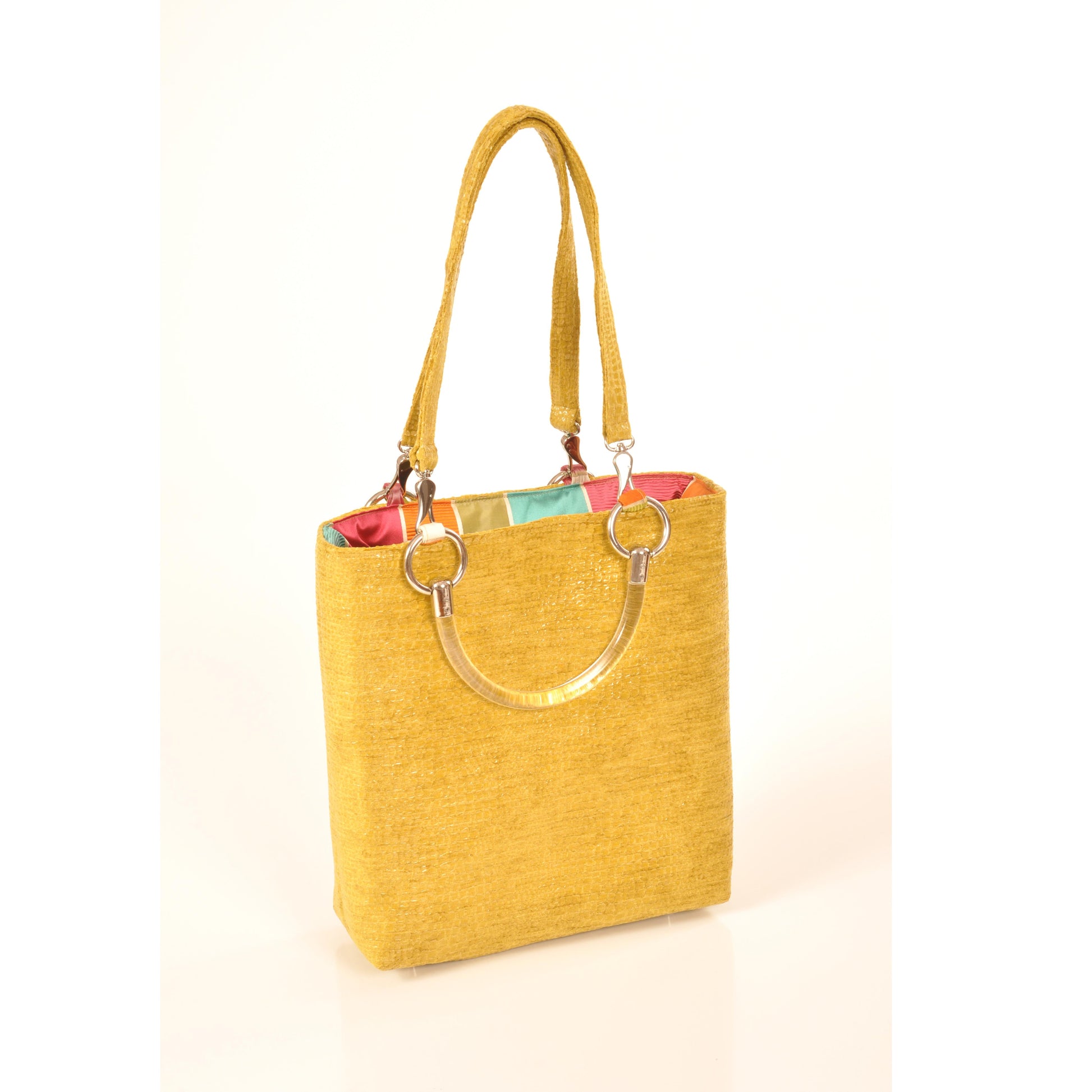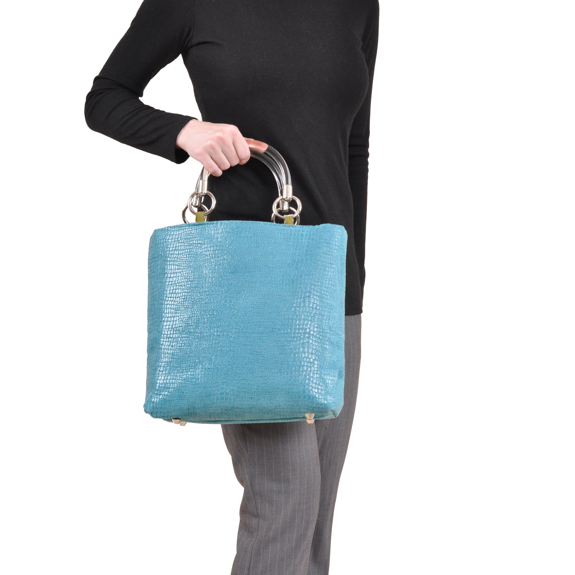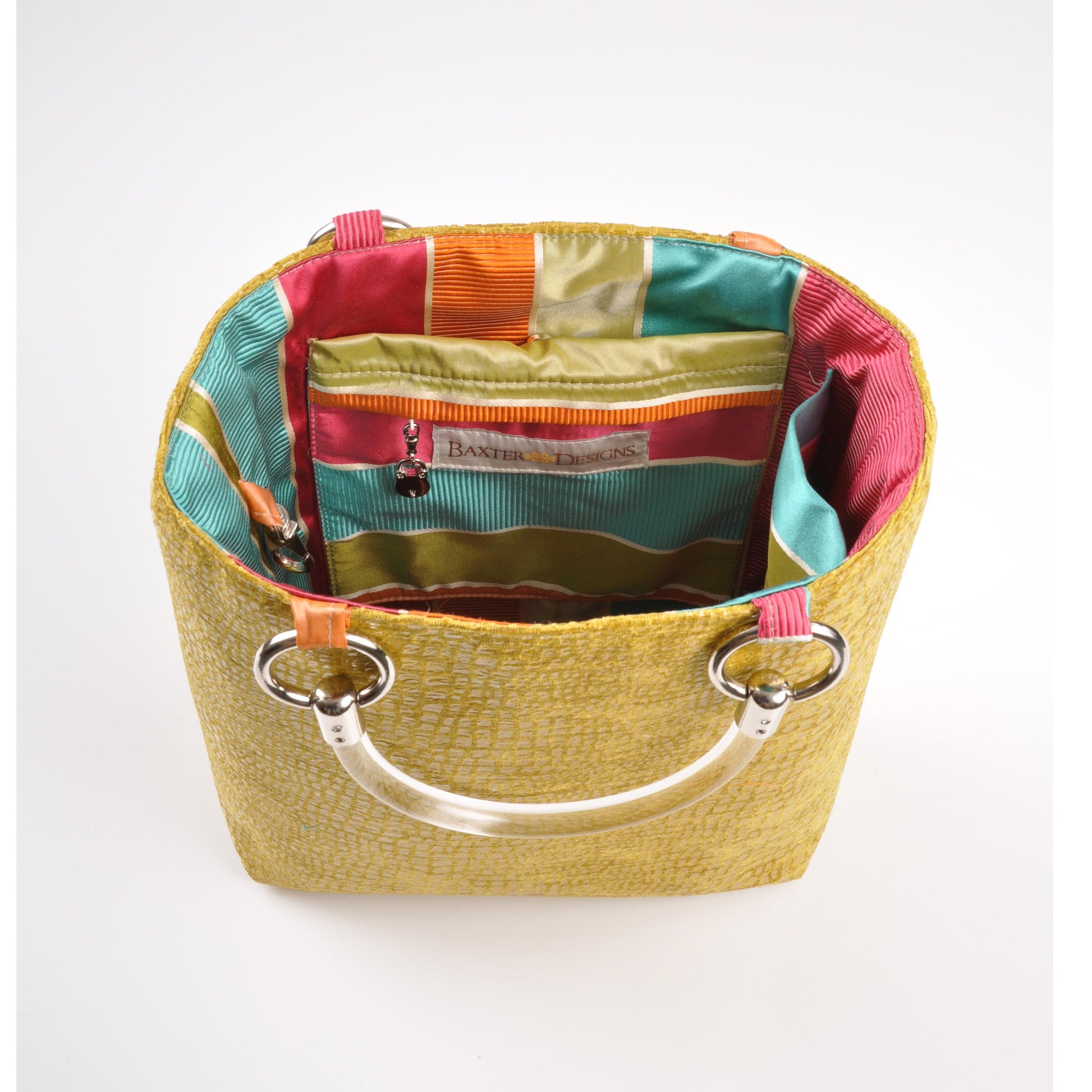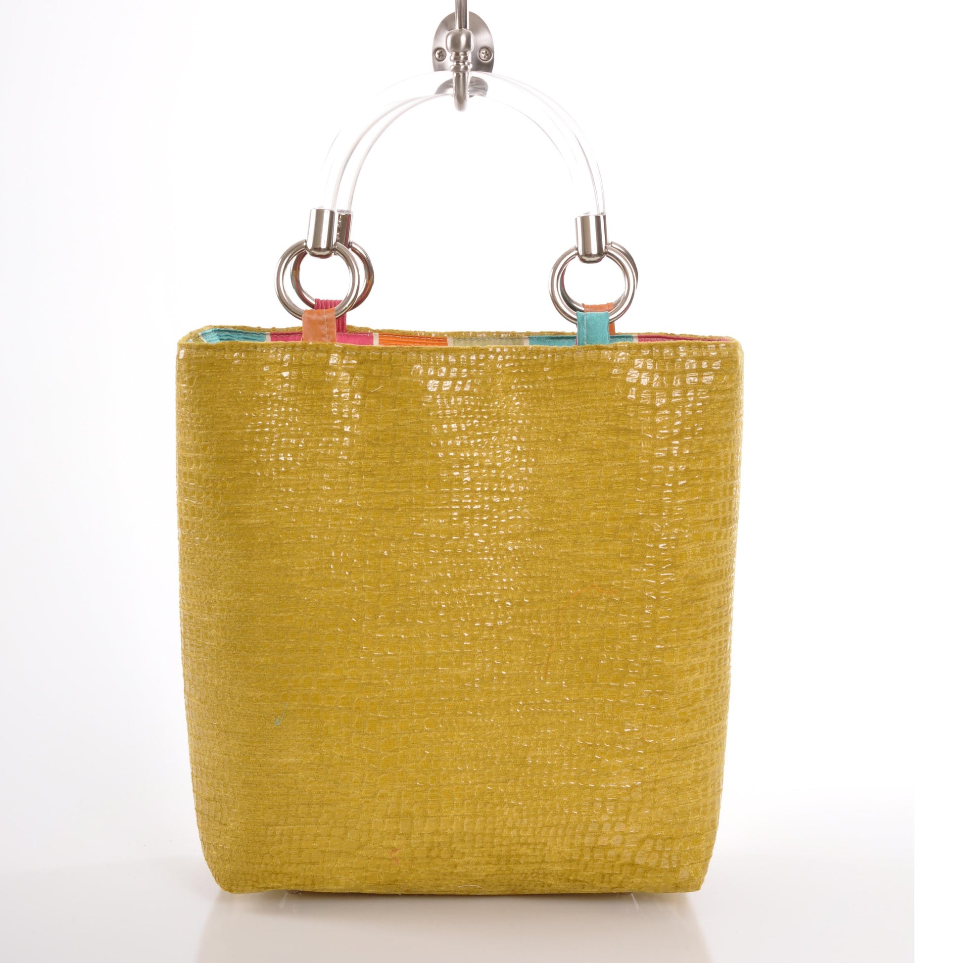 Embossed Ultra suede exterior, Stain resistant. 100% silk stripe interior with cellphone and zippered pockets. Key clip and bottom feet. Double Lucite handles 5" drop, and shoulder straps 10" drop.