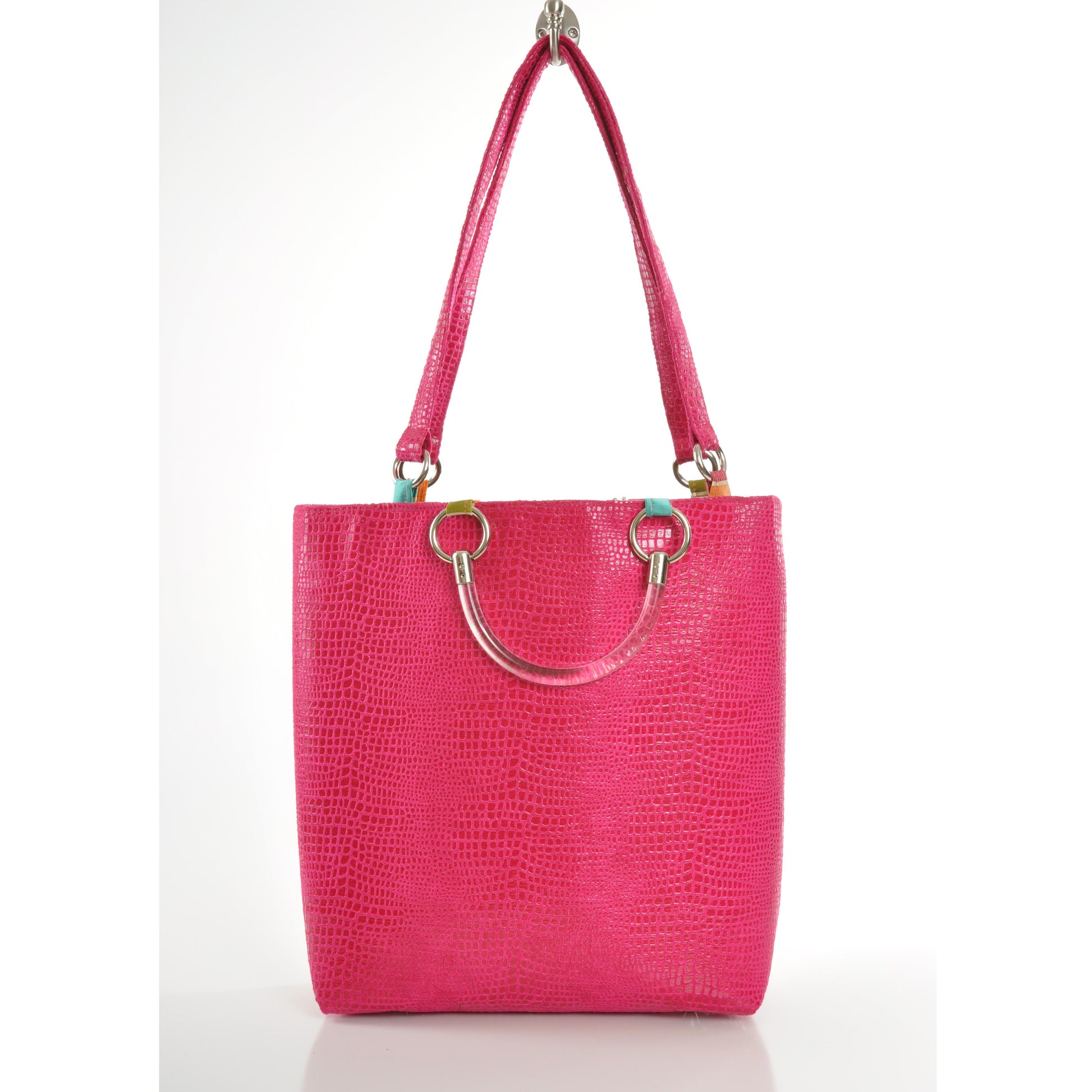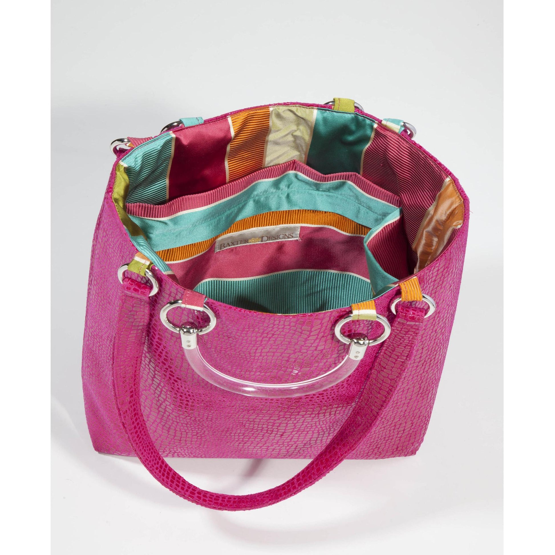 Embossed Ultra Suede exterior, Stain resistant. 100% silk stripe interior with cellphone and zippered pockets. Key clip and bottom feet. Double Lucite handles 5" drop, and shoulder straps 13" drop.