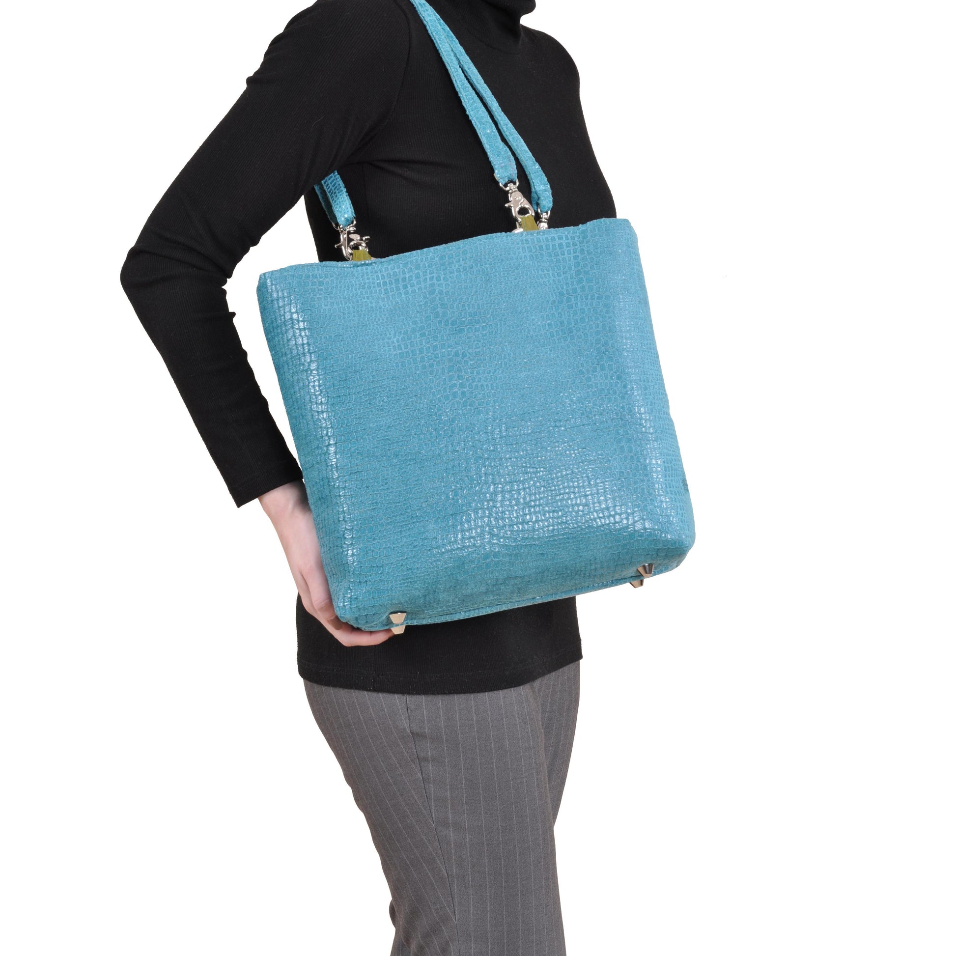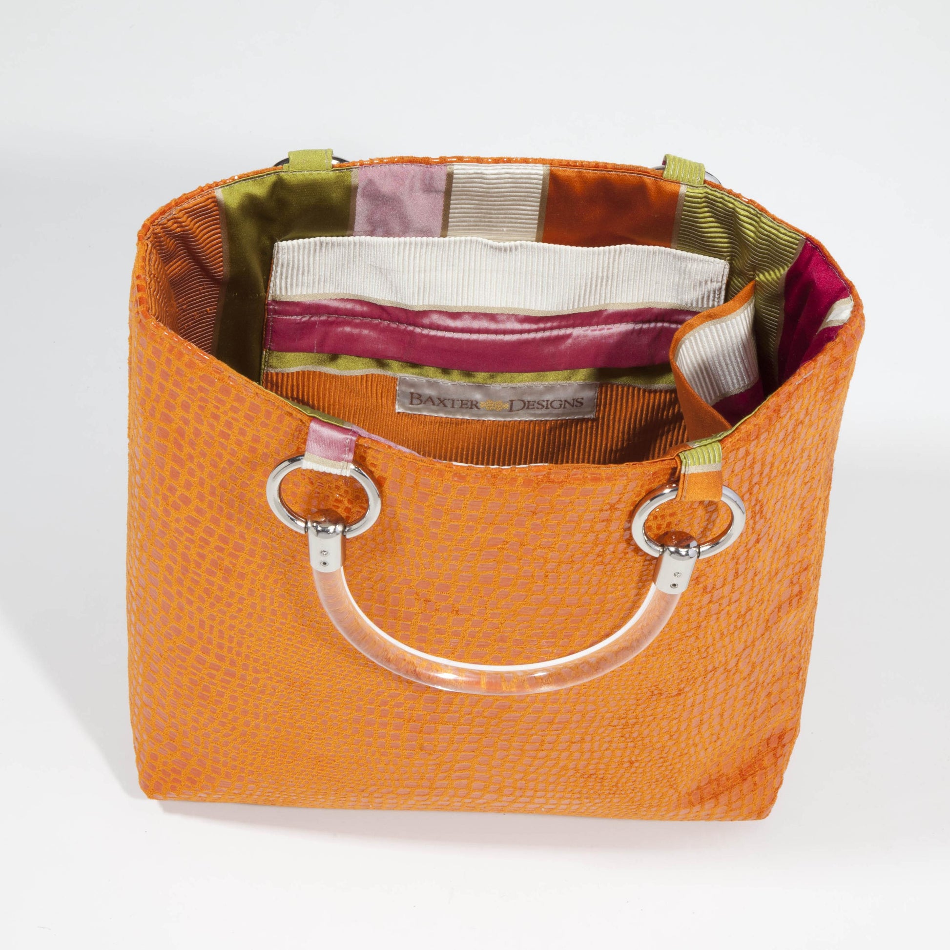Embossed Ultra suede exterior, Stain resistant. 100% silk stripe interior with cellphone and zippered pockets. Key clip and bottom feet. Double Lucite handles 5" drop, and shoulder straps 10" drop.
