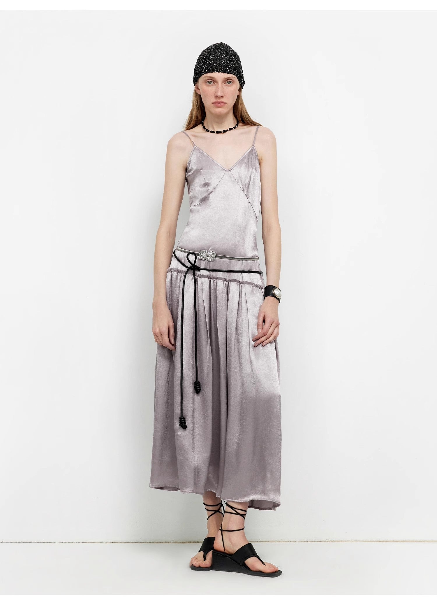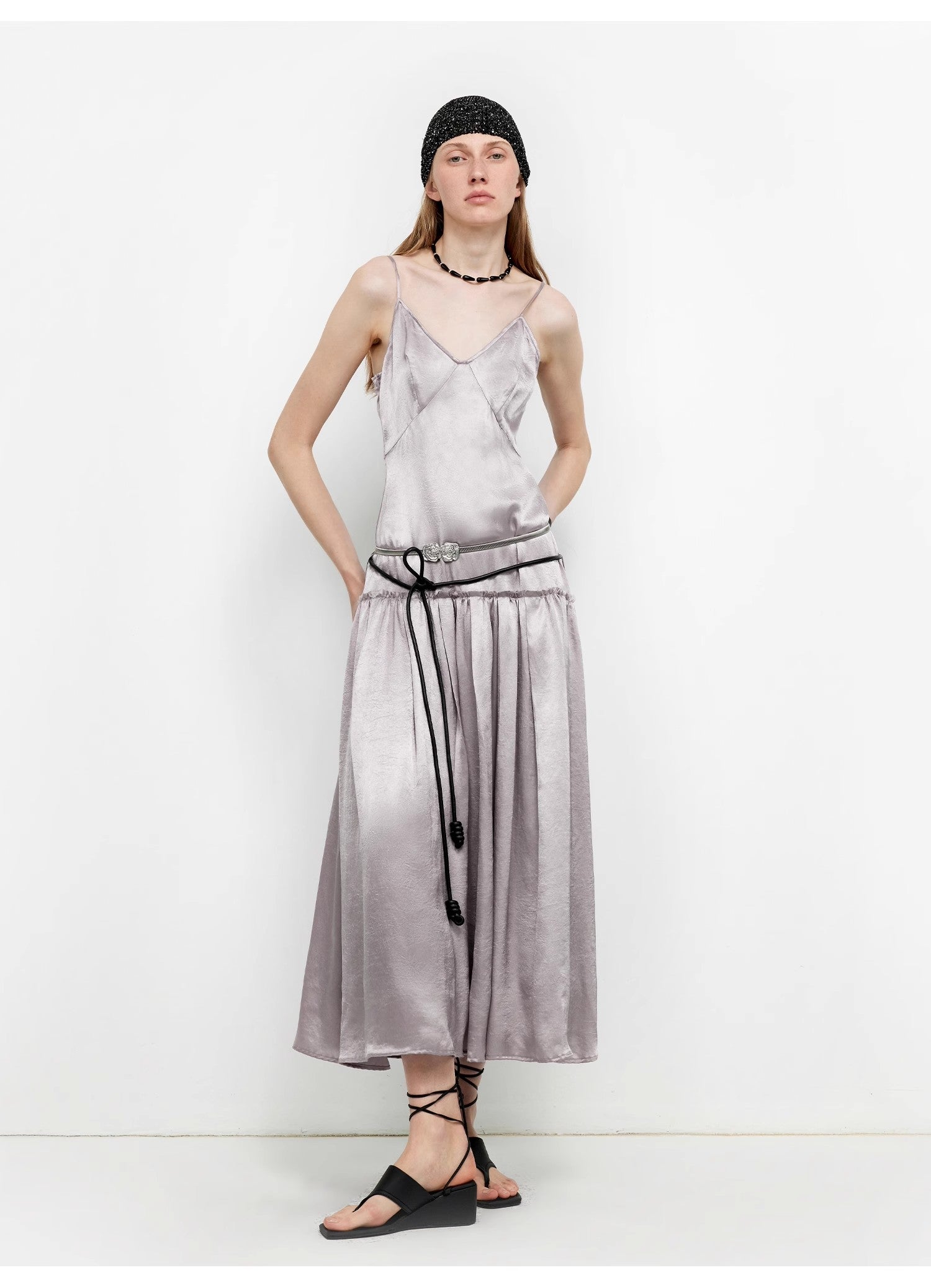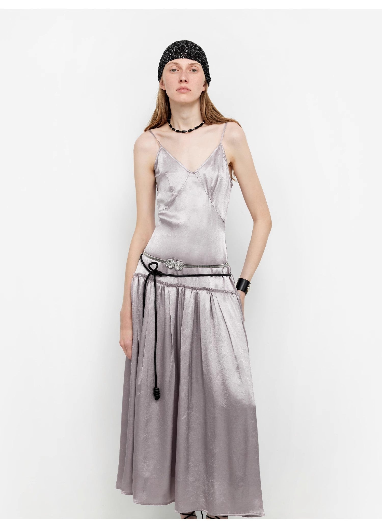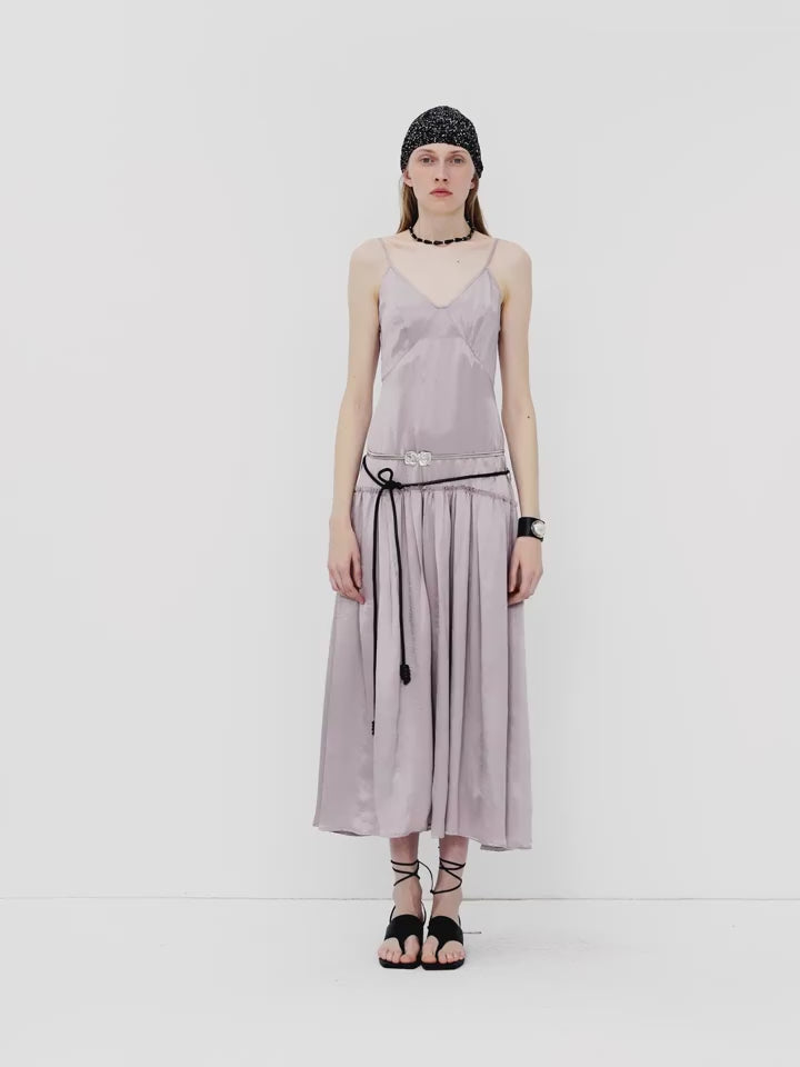 This spaghetti strap dress with a large skirt reaches the ankles, elongating the body proportion and making the wearer look slimmer and taller. Different from ordinary dresses, it features a vintage low waistline design. Lowering the waistline shifts the visual focus downward, emphasizing the hip line and making the overall silhouette more concise and stylish. The distinctive deep V-neck makes the wearer look slimmer and more elegant.