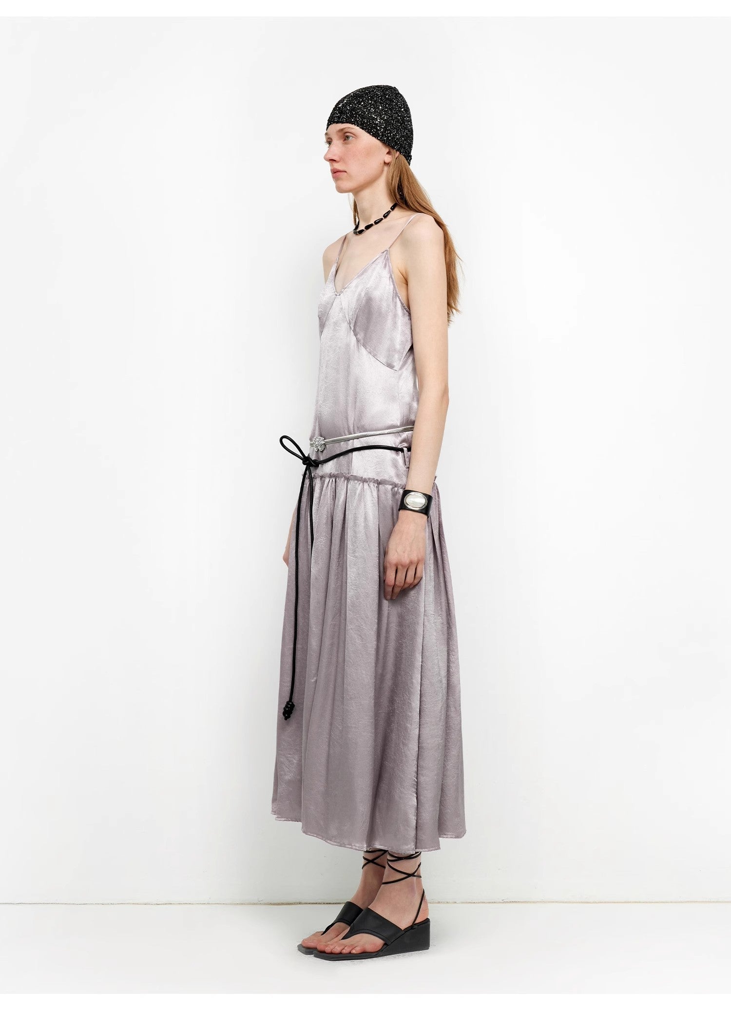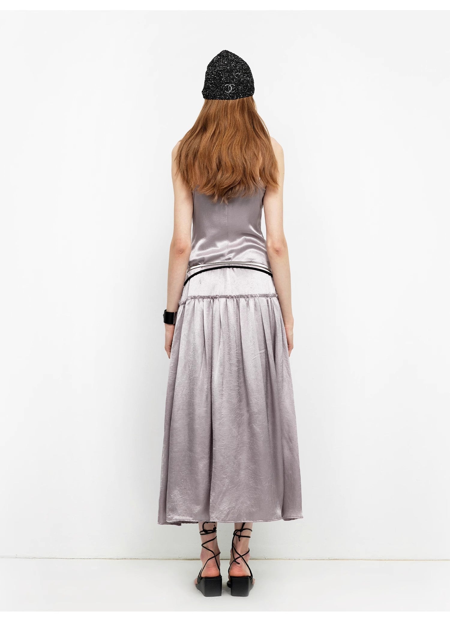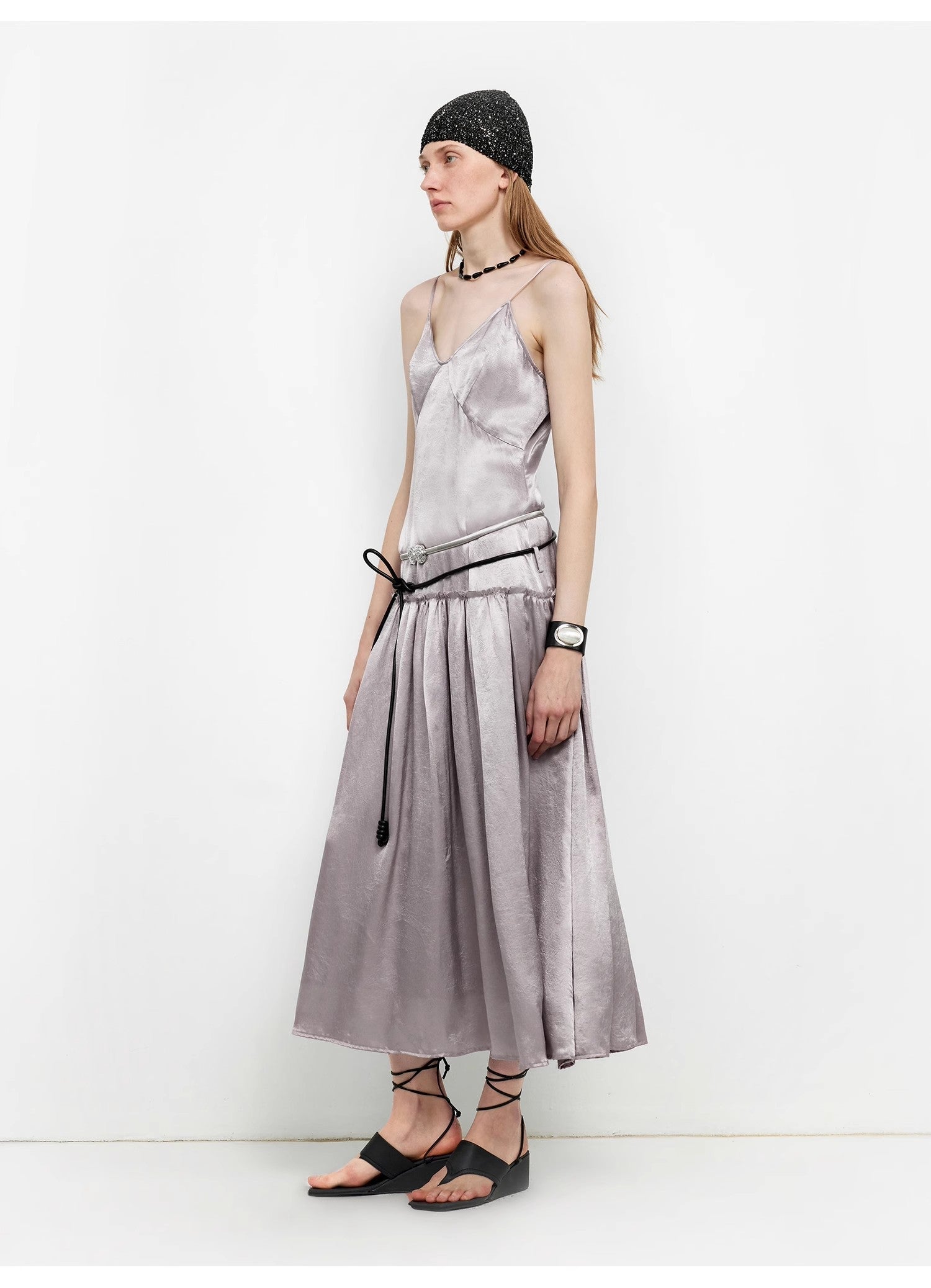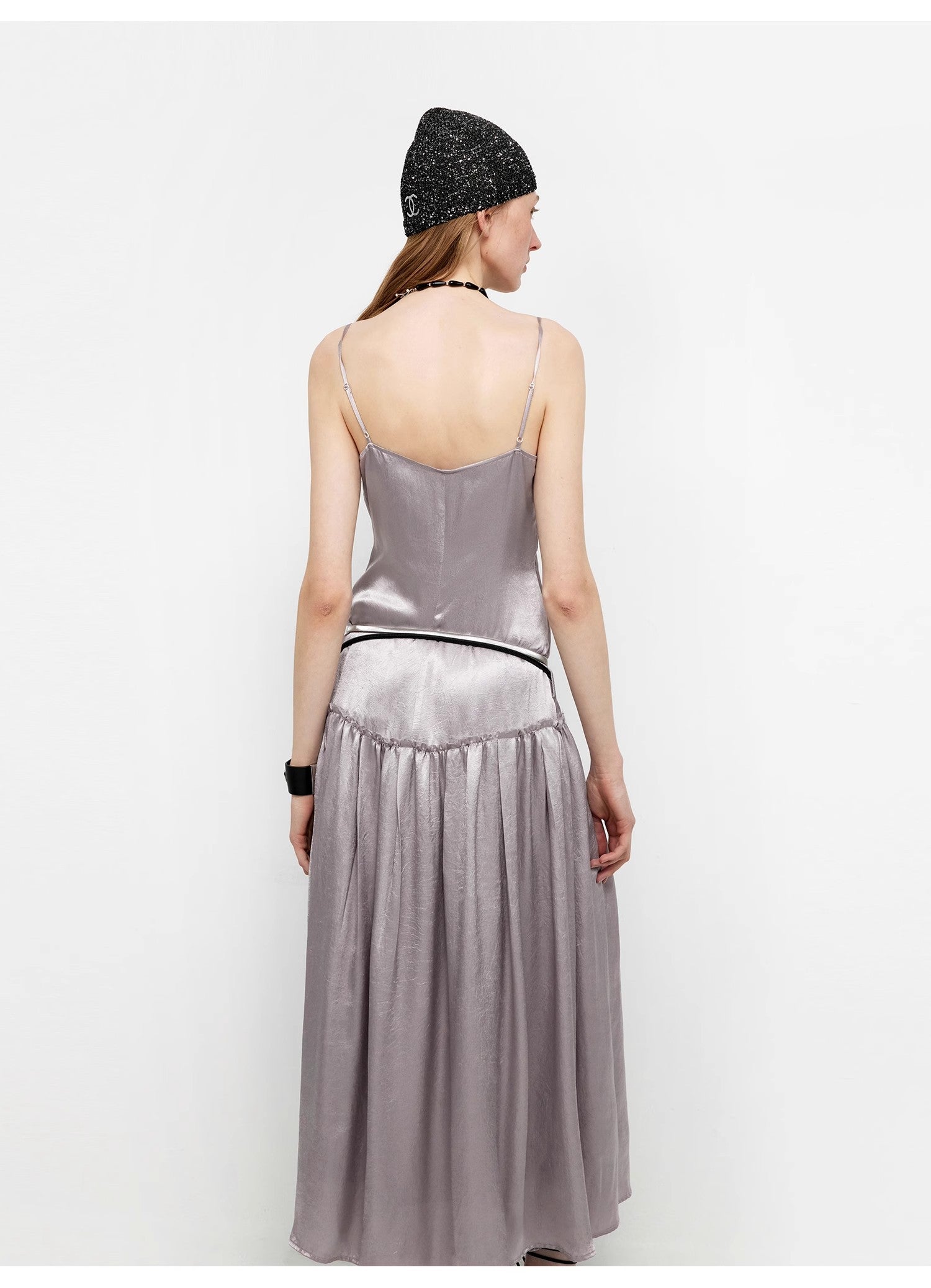 This spaghetti strap dress with a large skirt reaches the ankles, elongating the body proportion and making the wearer look slimmer and taller. Different from ordinary dresses, it features a vintage low waistline design. Lowering the waistline shifts the visual focus downward, emphasizing the hip line and making the overall silhouette more concise and stylish. The distinctive deep V-neck makes the wearer look slimmer and more elegant.