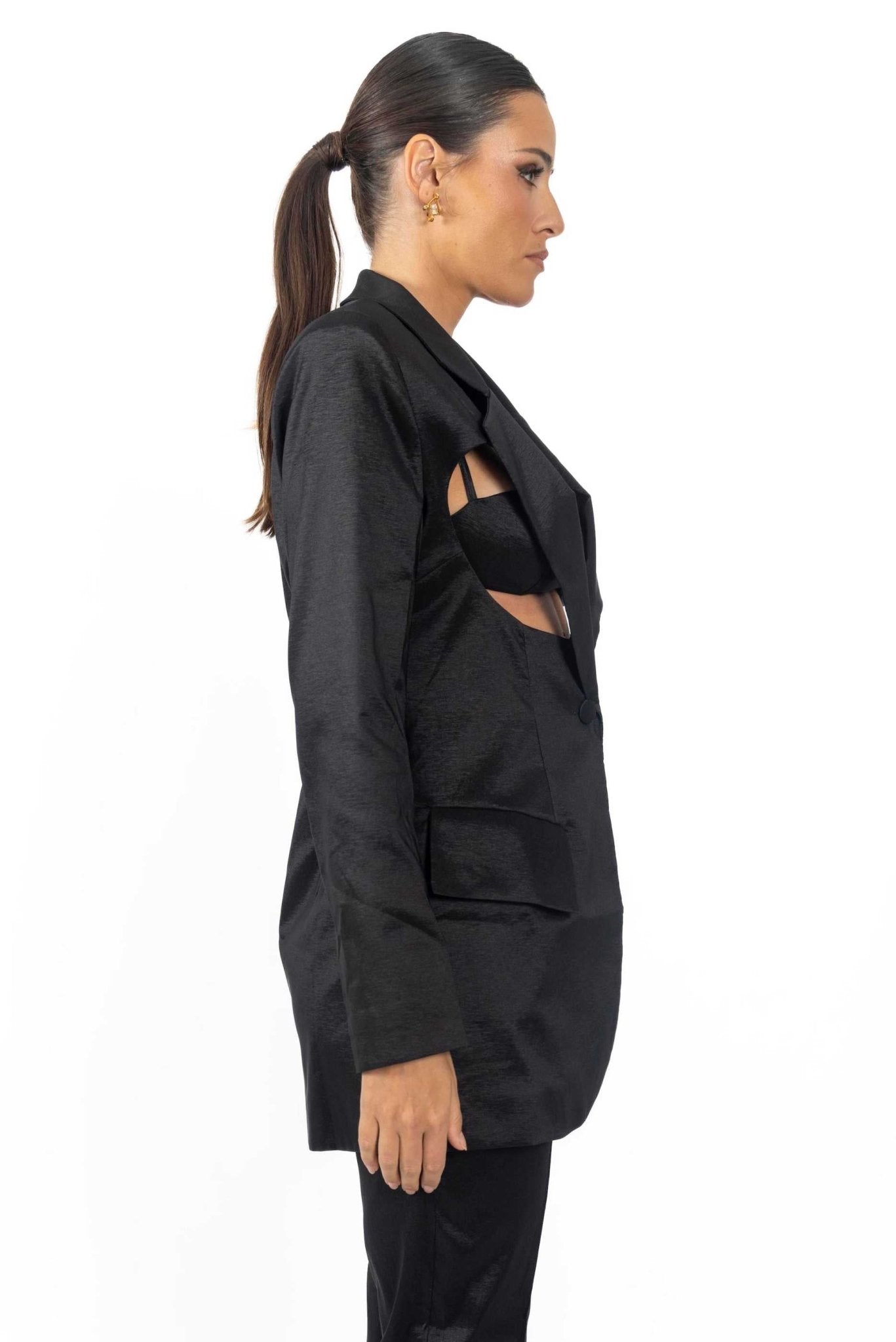 The cutout black color blazer with bralette is made from a luxurious silk-like fabric that feels like the softest. This blazer has a slim fit and long sleeves, and it's finished with a button-down front. The matching bralette is lined in silk charmeuse and has straps for an unparalleled fit.