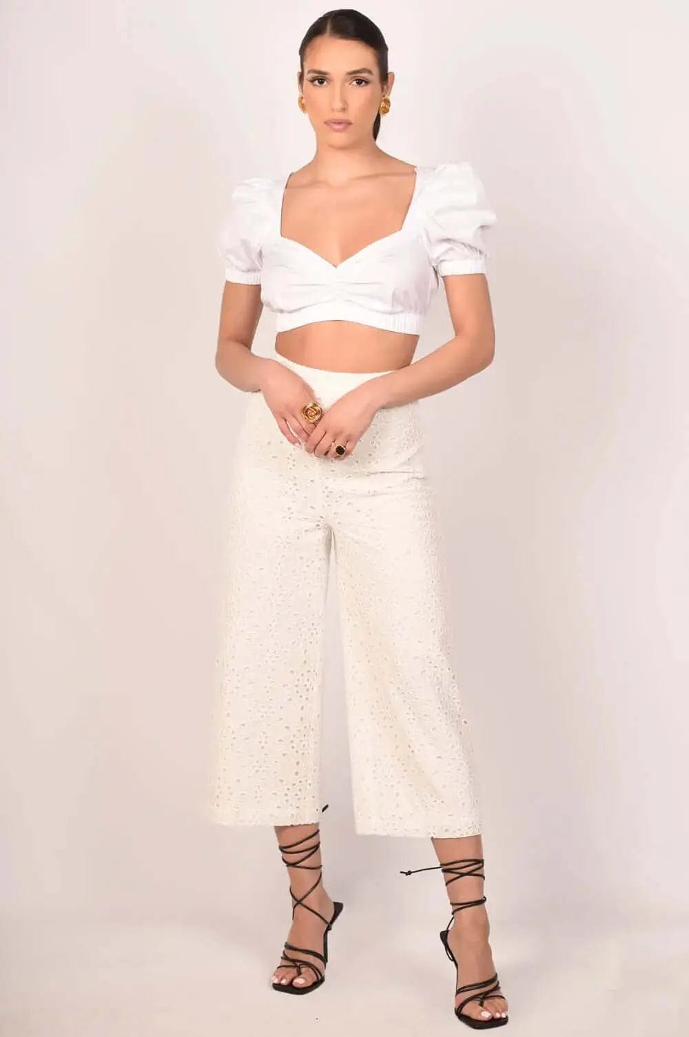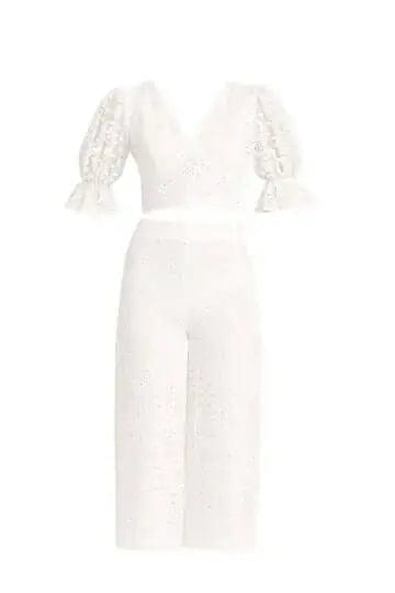 A modern ensemble crafted with an eyelet fabric in classic white color. Â The pants have a fitted silhouette contrasted with wide hems. Â Not sold as set.