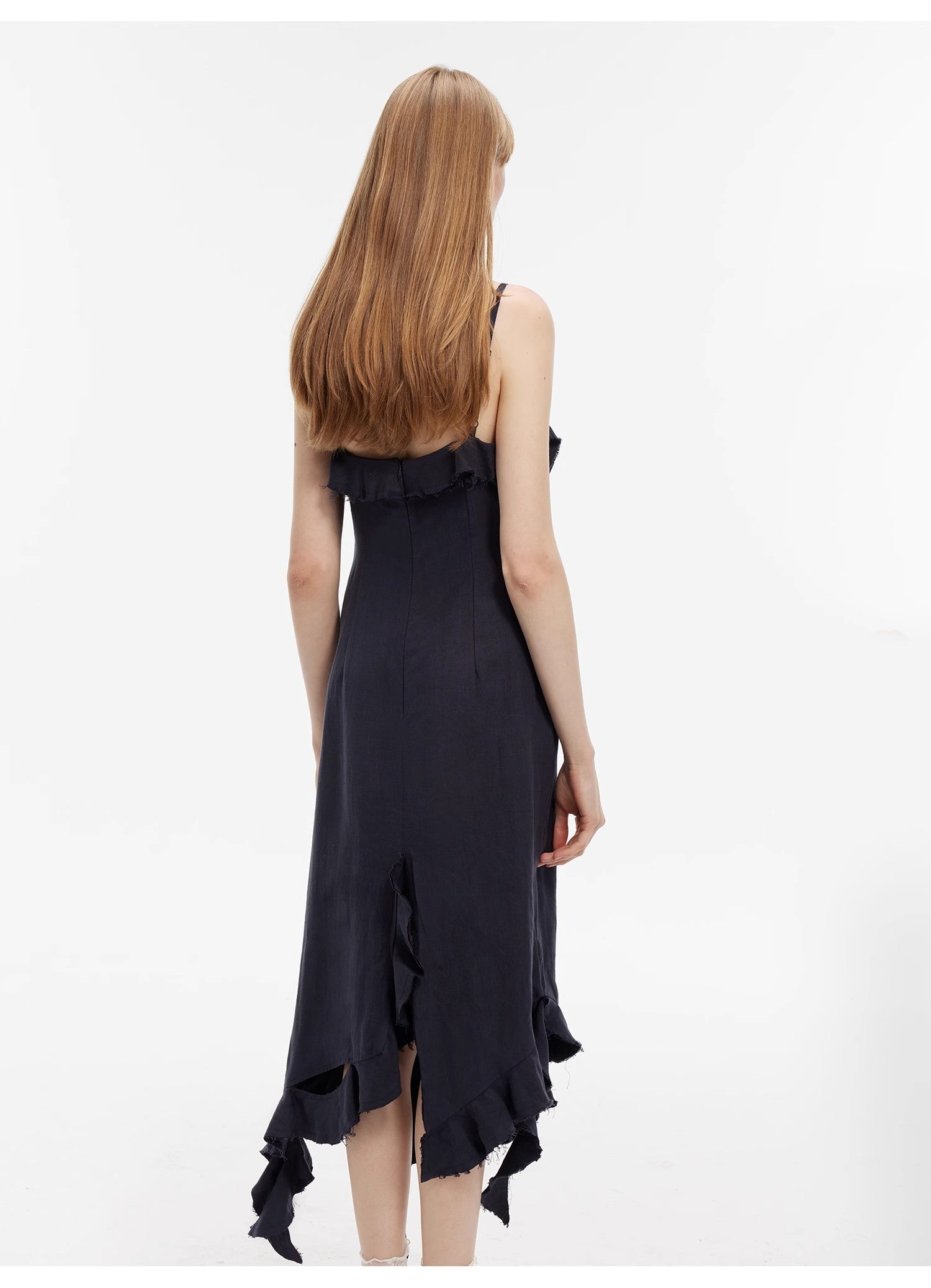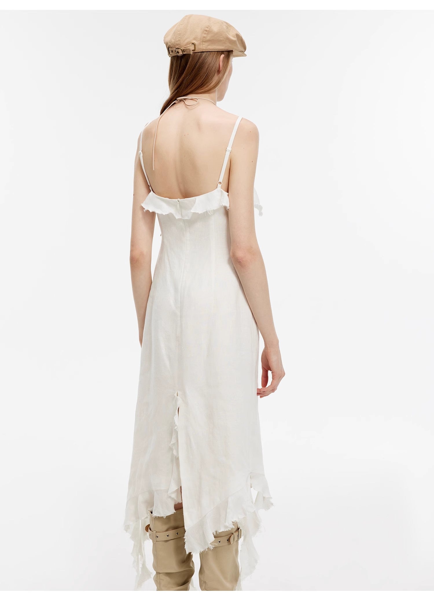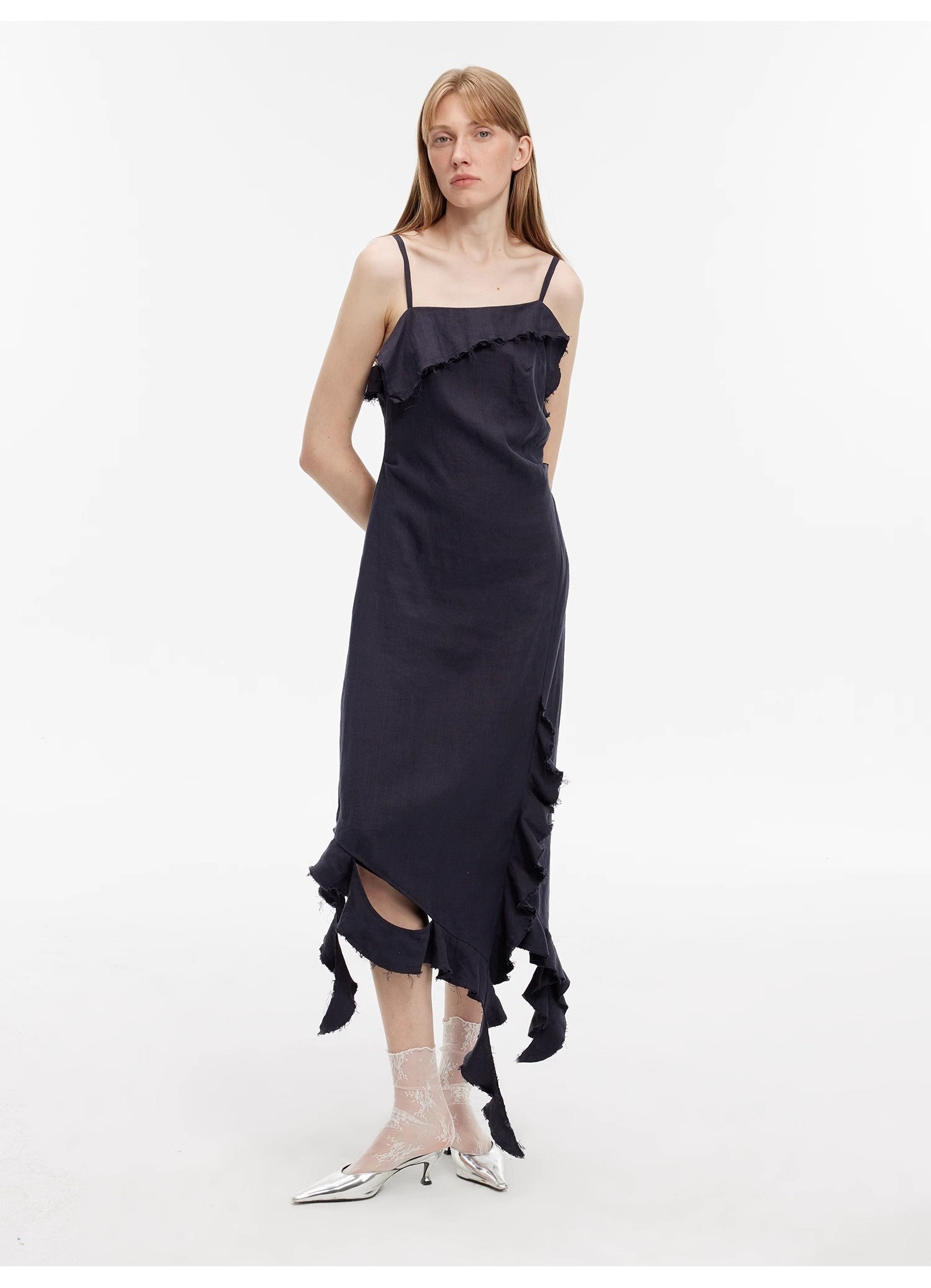 "Summer Whisper" Sand-Washed Linen Sling Ruffled Irregular Fit Sling Dress