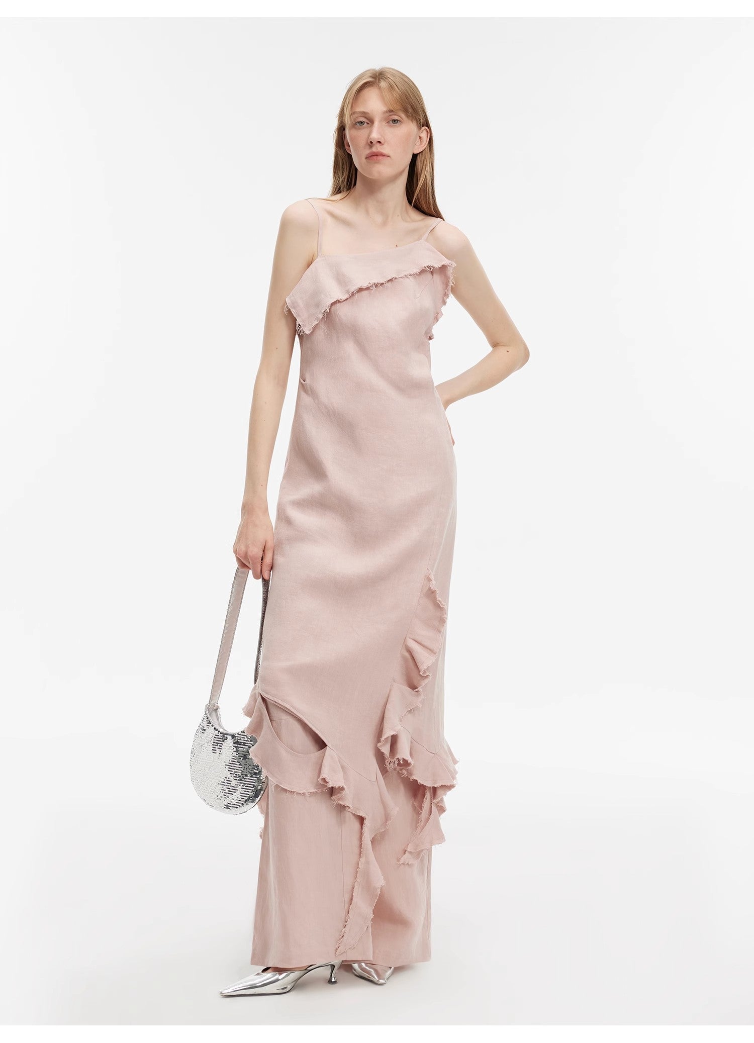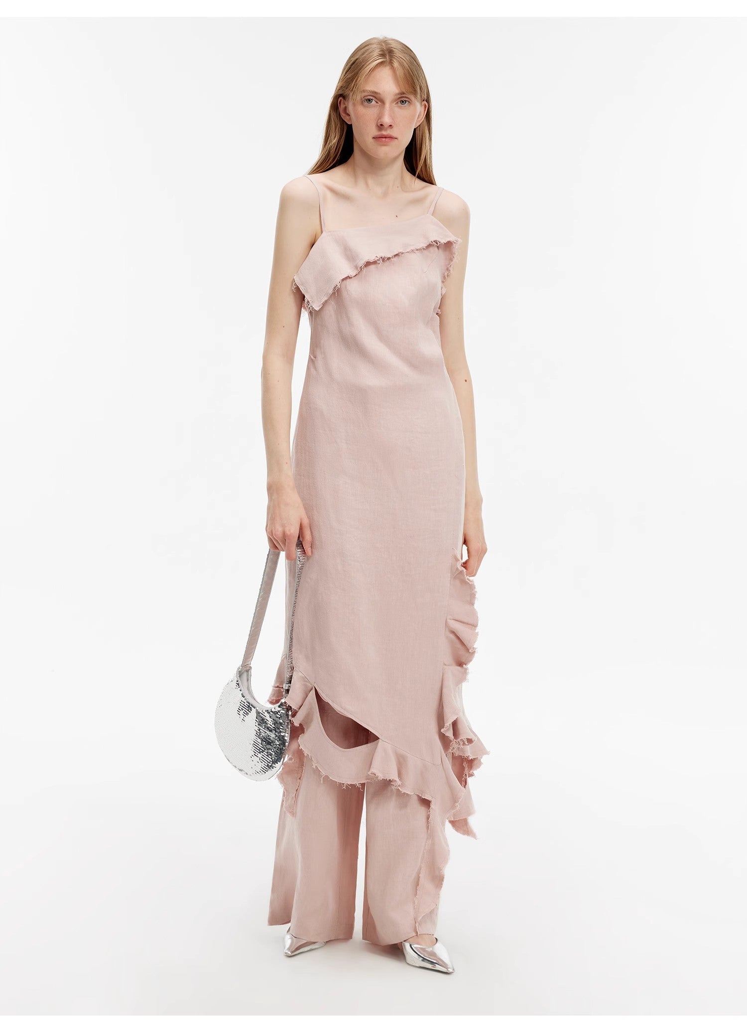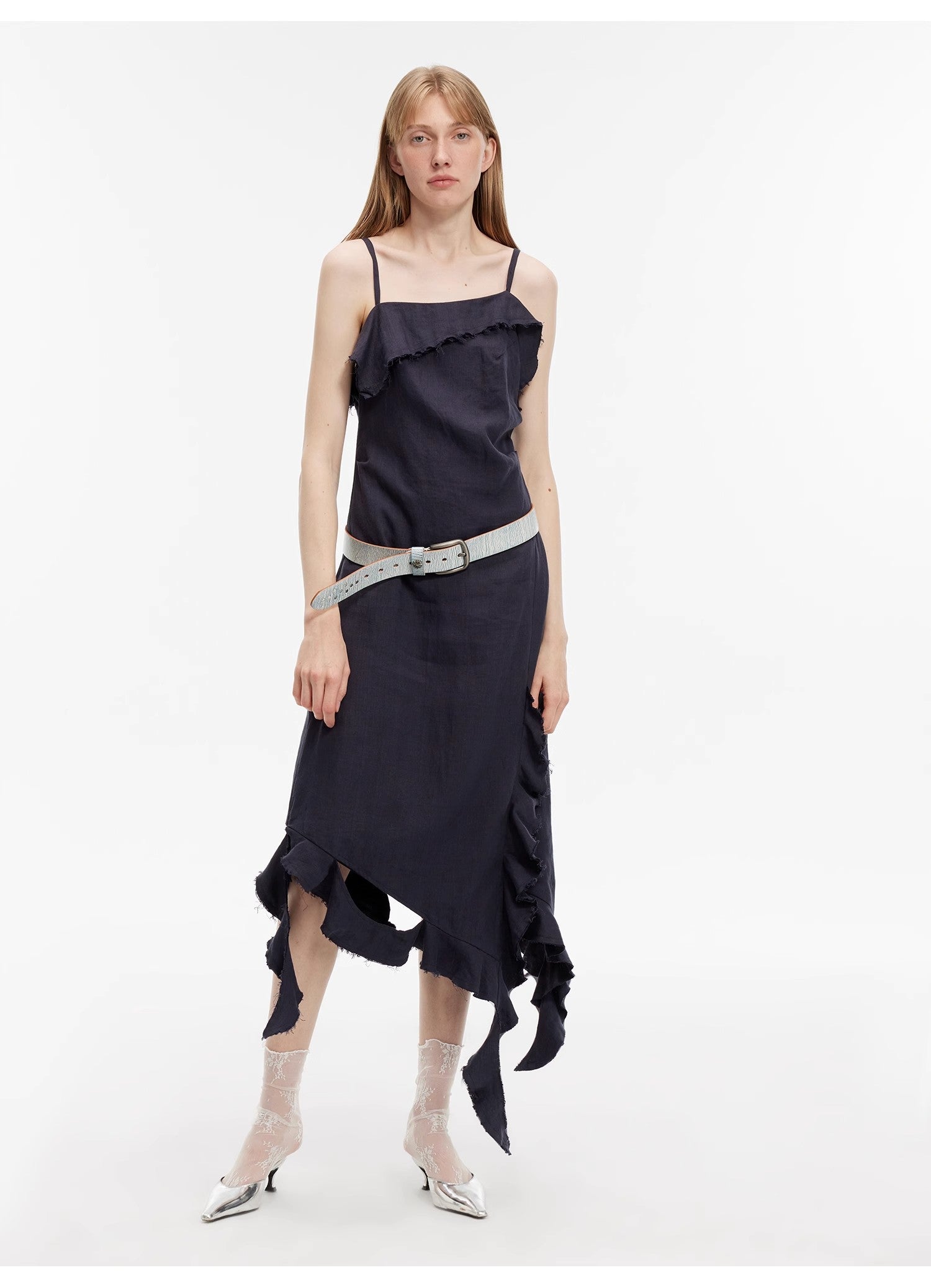 "Summer Whisper" Sand-Washed Linen Sling Ruffled Irregular Fit Sling Dress