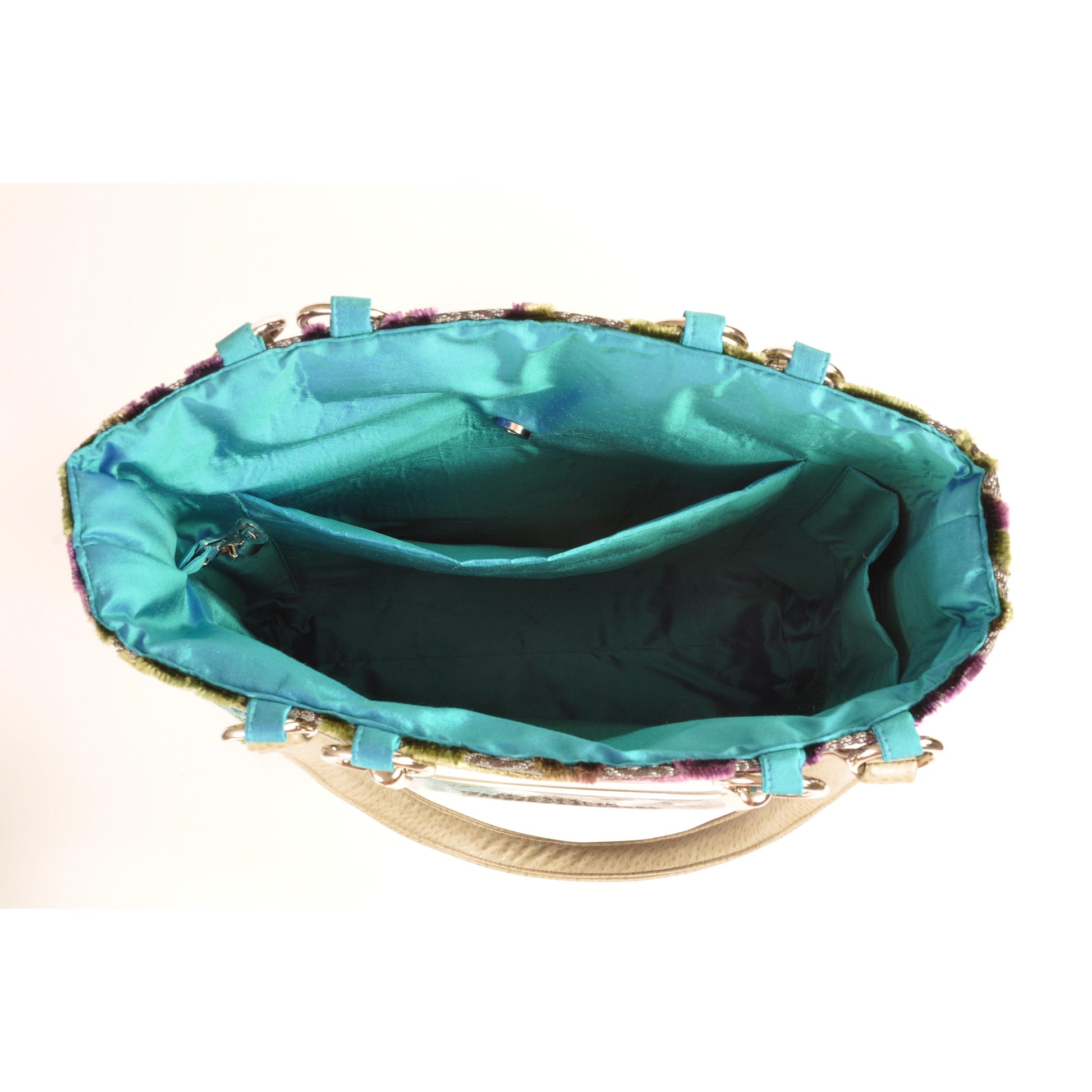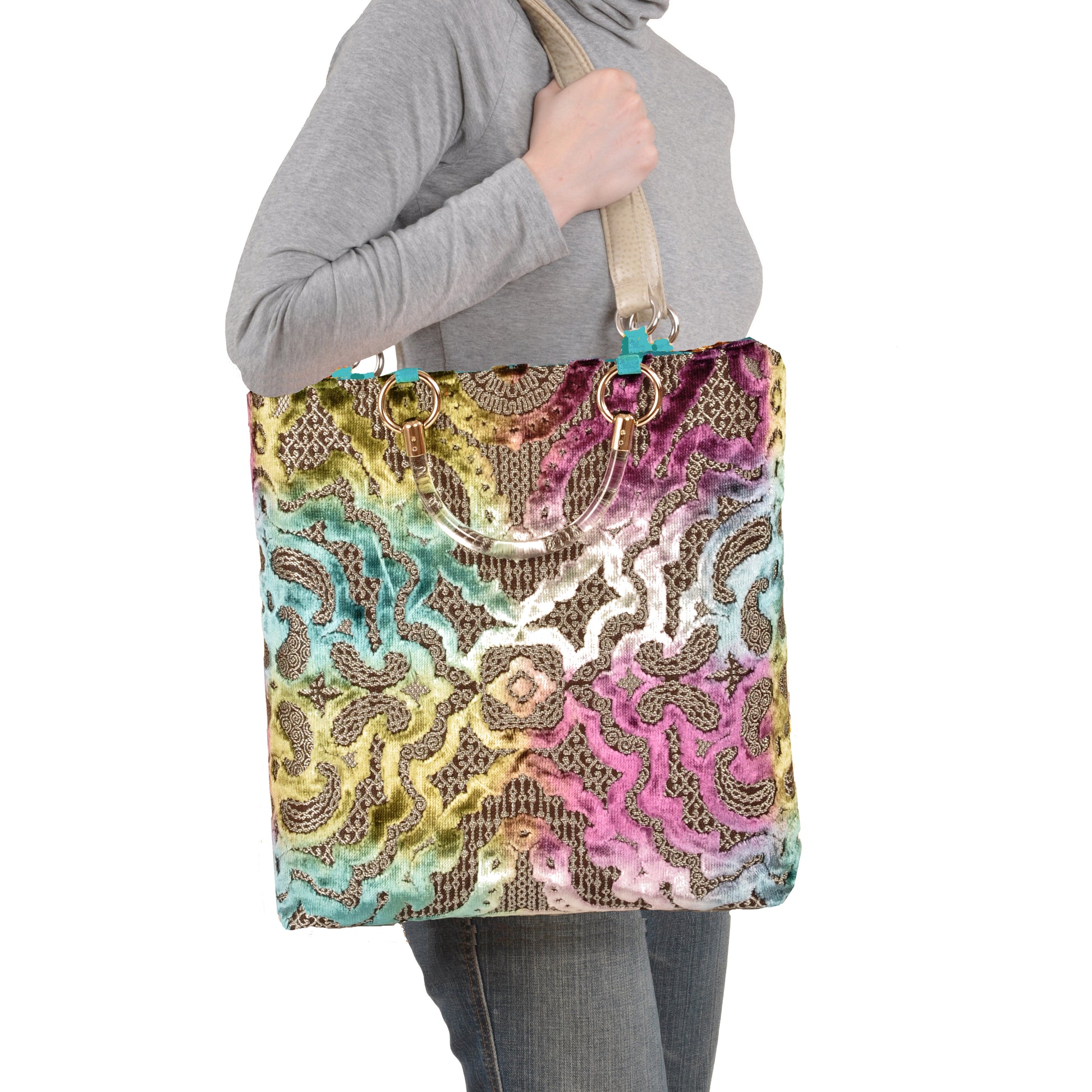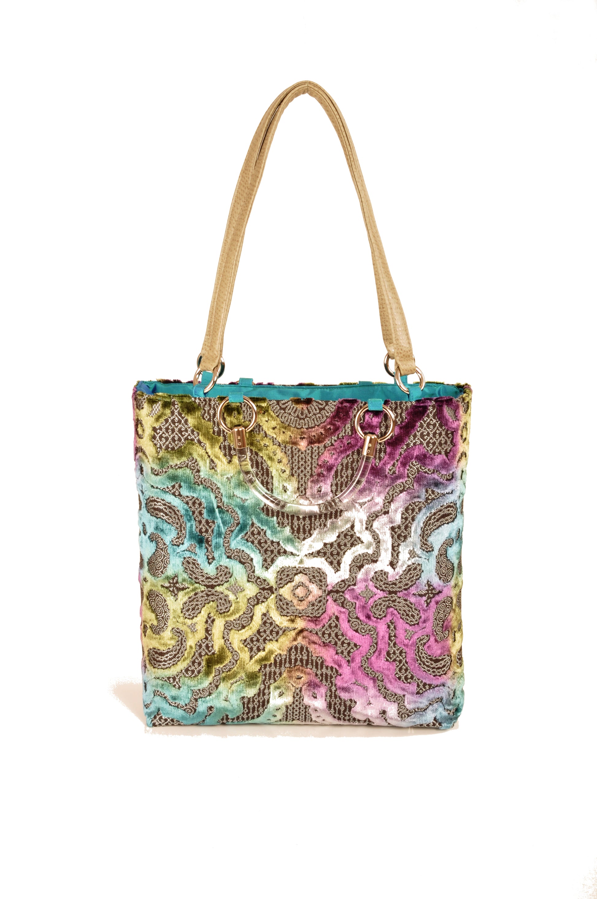 Cut Velvet exterior, Stain resistant. 100% silk interior with cellphone and zippered pockets. Key clip and bottom feet. Double Lucite handles 5" drop, and shoulder straps 13" drop.