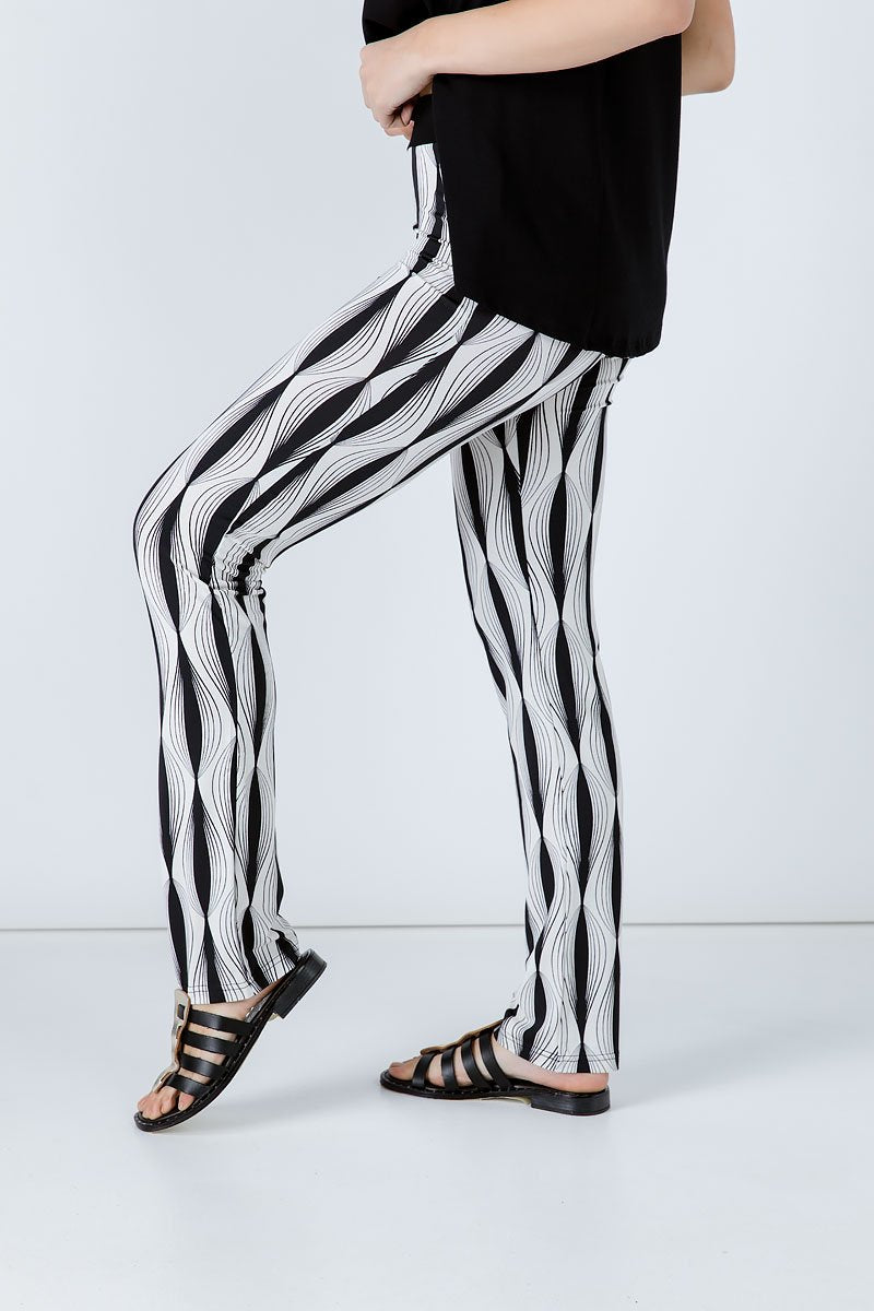 Full length black and white print pants in stretch jersey fabric, rayon-elastane. 5cm elasticated waistband in black stretch jersey fabric. Mid rise. Slightly fitted and opens slightly towards the ankle. Our model is 172cm and is wearing size 36/S. Measurements for size 38 (in cm): Waist-32, Bottom-42, Body length-101/82.