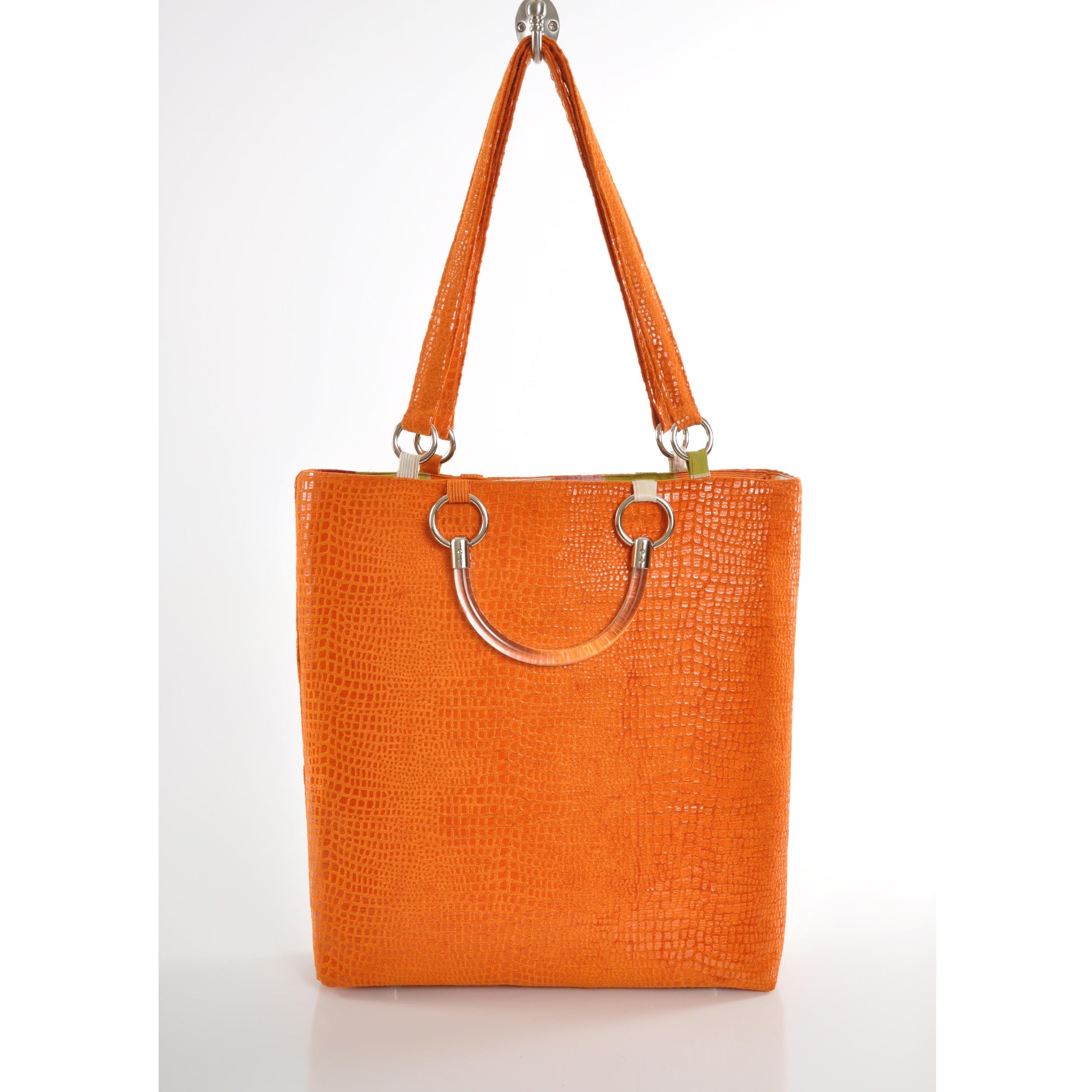 Embossed Ultra Suede exterior, Stain resistant. 100% silk stripe interior with cellphone and zippered pockets. Key clip and bottom feet. Double Lucite handles 5" drop, and shoulder straps 13" drop.