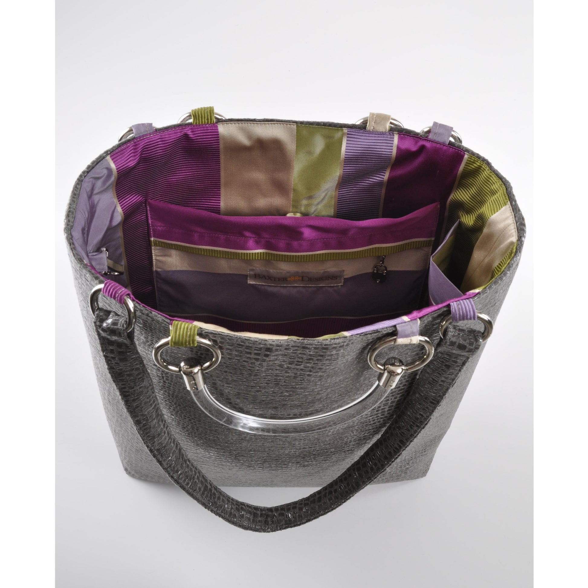 Embossed Ultra Suede exterior, Stain resistant. 100% silk stripe interior with cellphone and zippered pockets. Key clip and bottom feet. Double Lucite handles 5" drop, and shoulder straps 13" drop.
