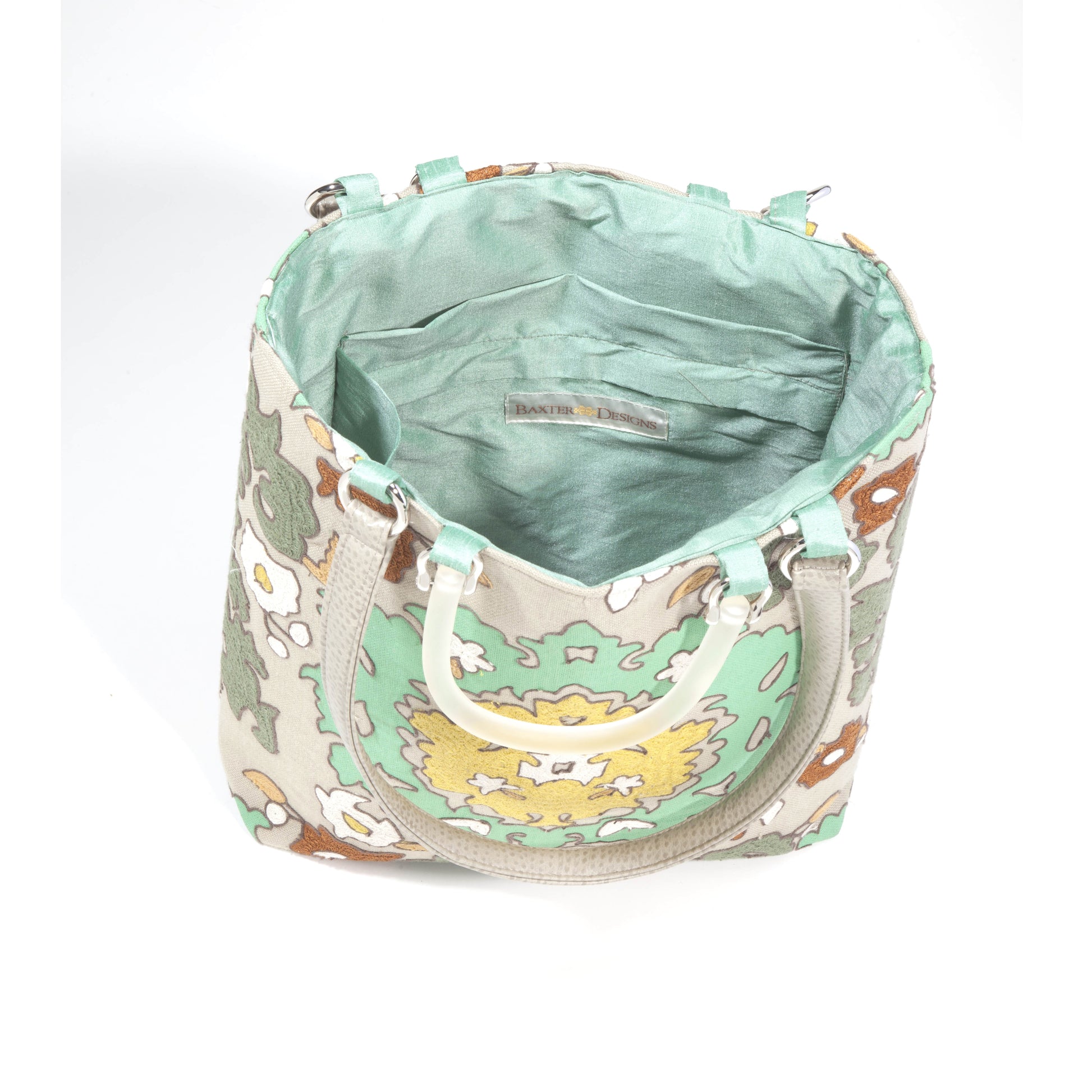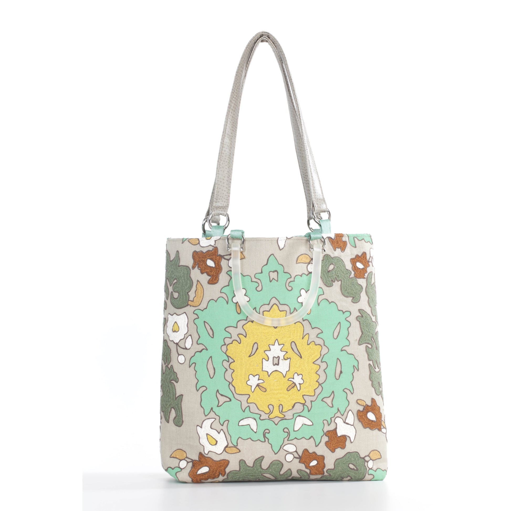 Embroidered Linen exterior, Stain resistant. 100% silk interior with cellphone and zippered pockets. Key clip and bottom feet. Double Lucite handles 5" drop, and shoulder straps 13" drop.