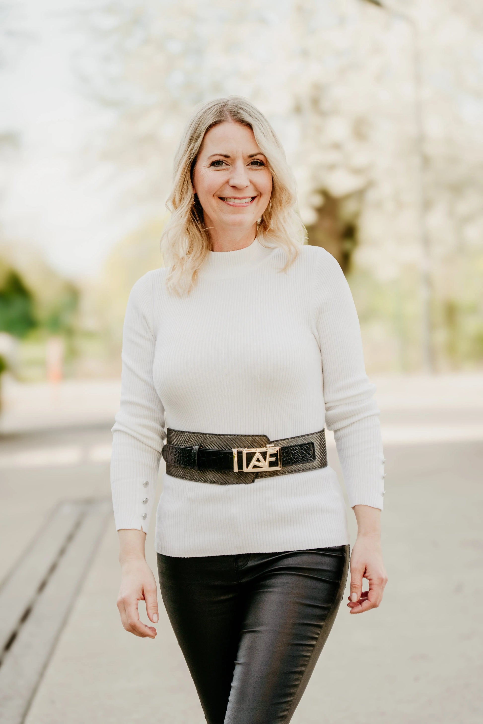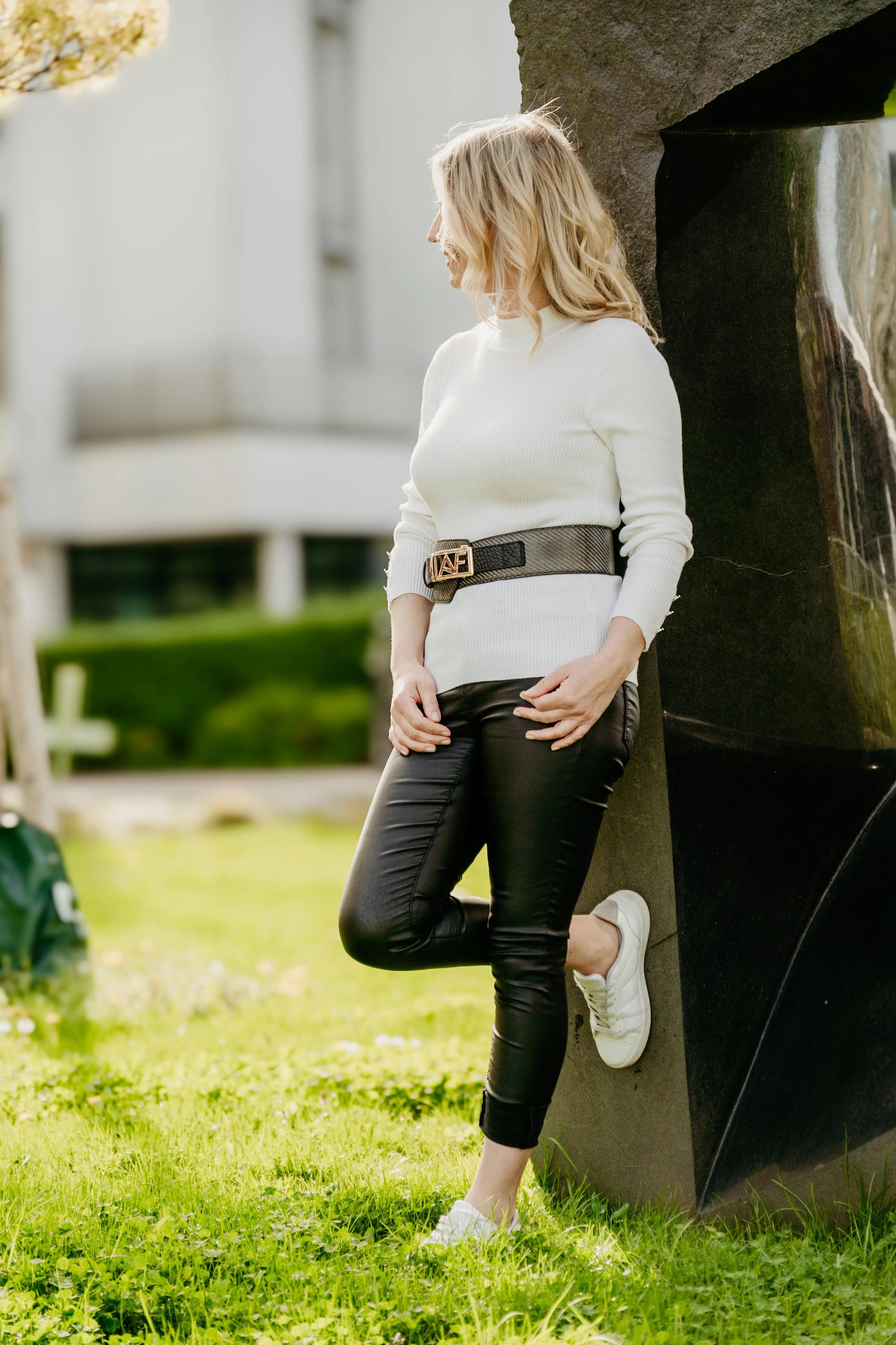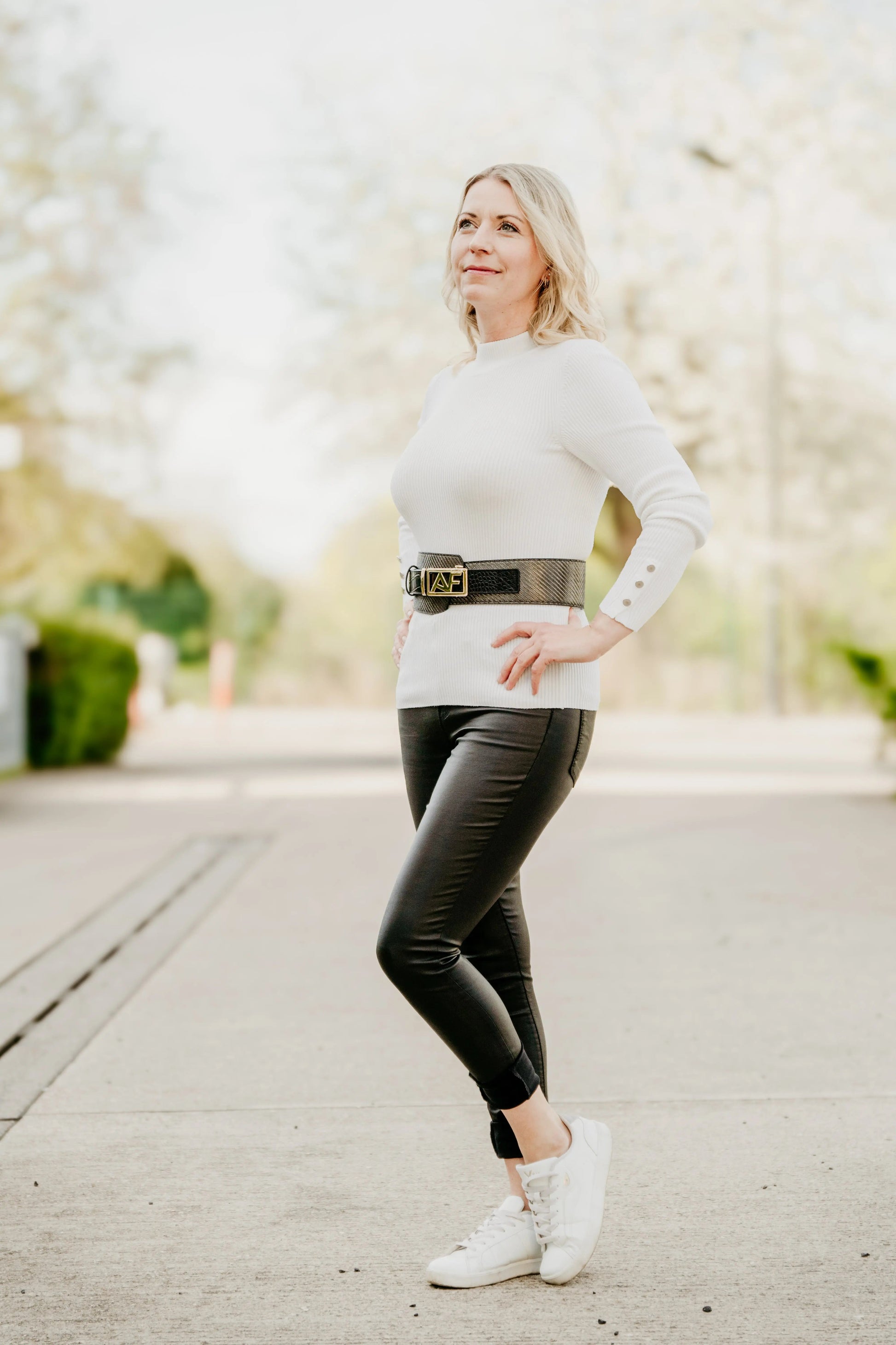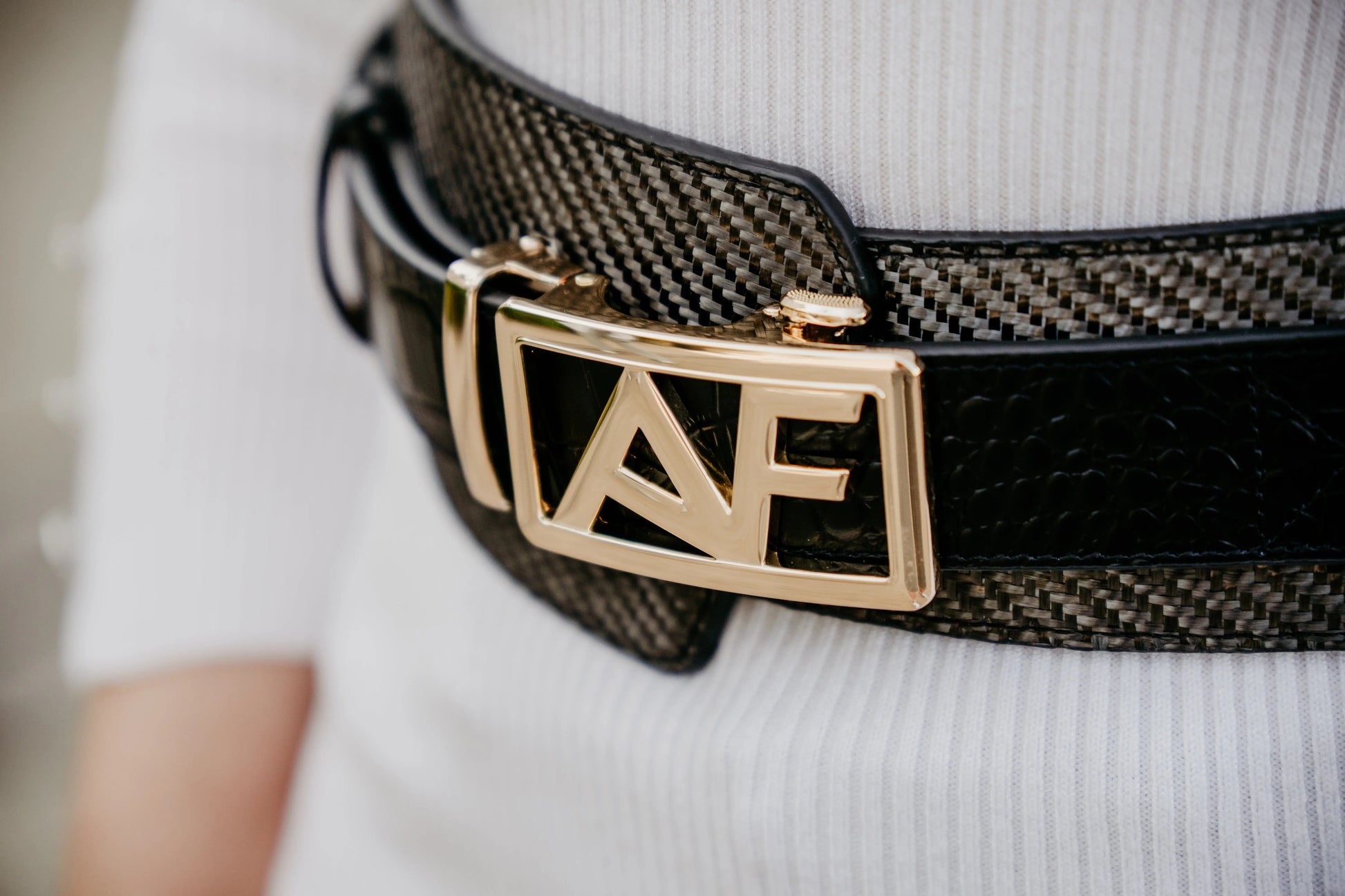 - Our wide women's carbon belt combines innovative materials with a modern design for outstanding durability and style. The outside is made of high-quality carbon, which is not only light and robust, but also gives a sophisticated look. The inside of the belt is lined with first-class leather, which ensures maximum comfort and durability. The integrated ratchet closure allows for precise adjustment and effortless opening and closing of the belt. This mechanism allows you to adjust the belt to the millimeter for a perfect fit. This makes the belt ideal for any occasion, be it in the office or at leisure. Available in sizes S and M, this belt offers enough room for waist sizes from Size S ( 85 cm to 94 cm and Size M (95 cm to 104 cm), allowing for individual adjustment. The high-quality materials and the well-thought-out construction make this belt a reliable companion for everyday use.