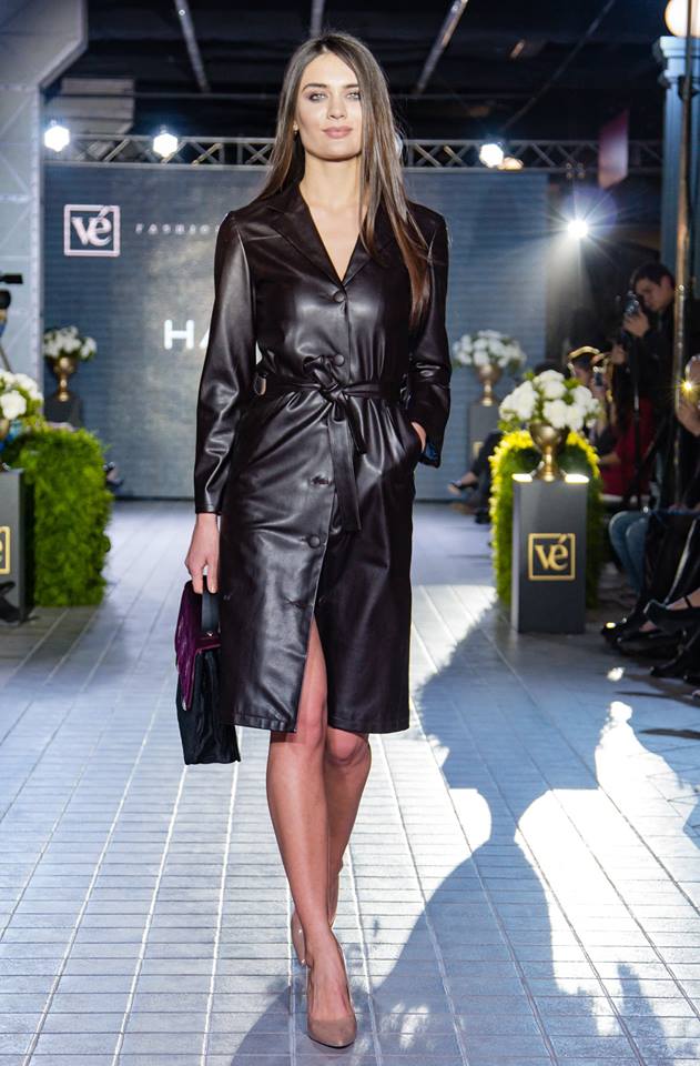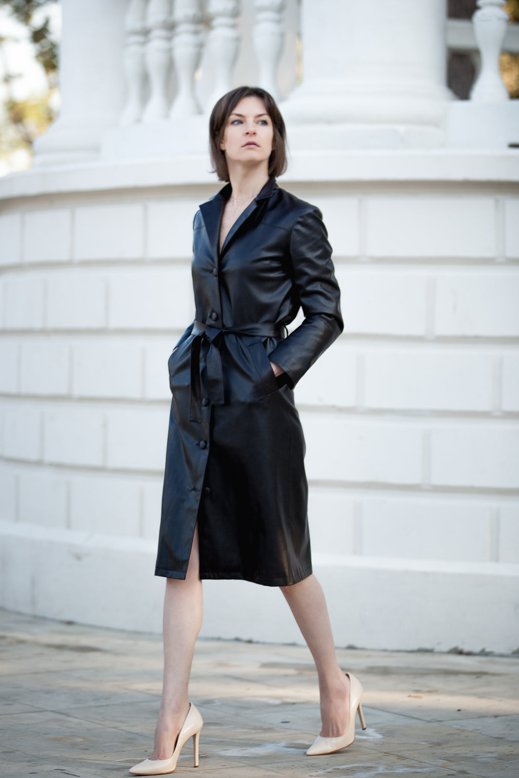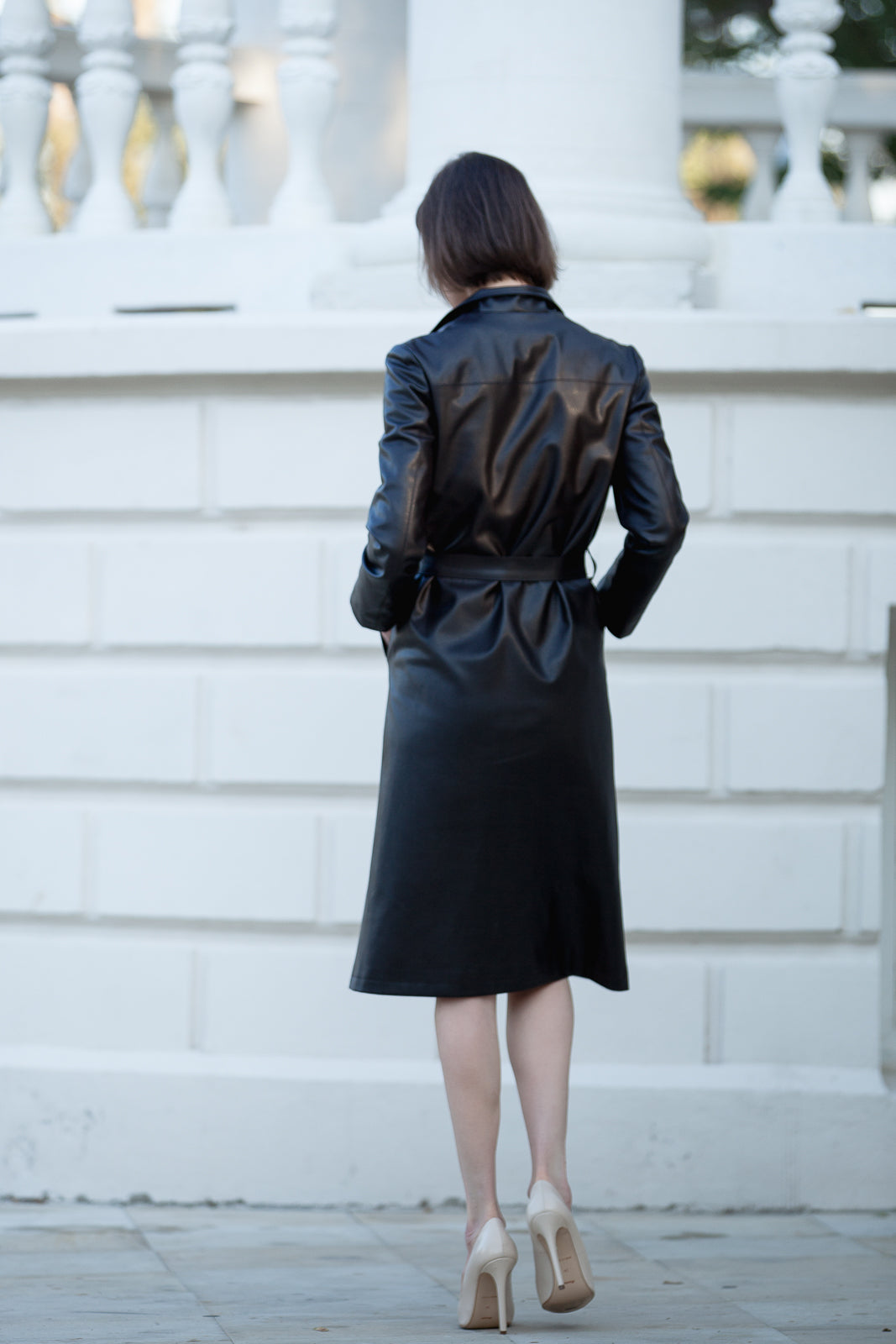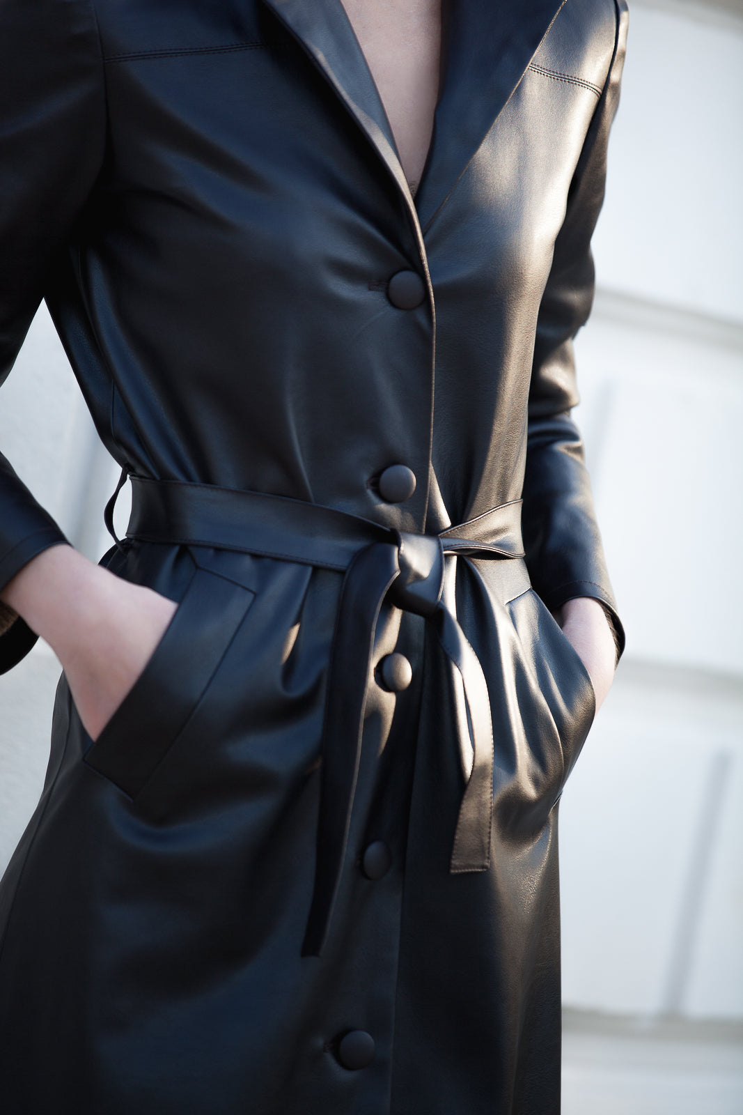 This faux leather coat has detachable belt, side pockets and button fastenings through front.