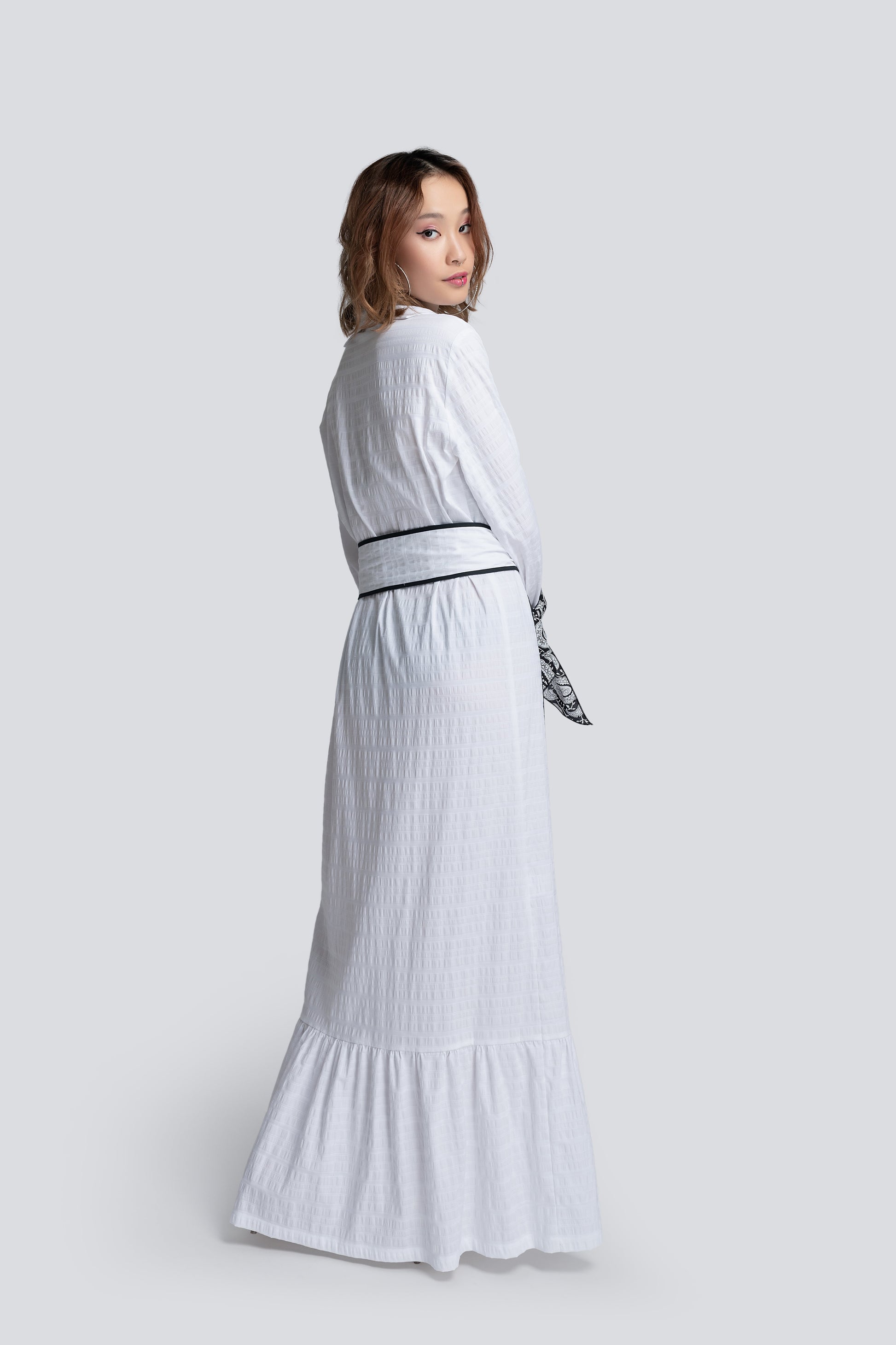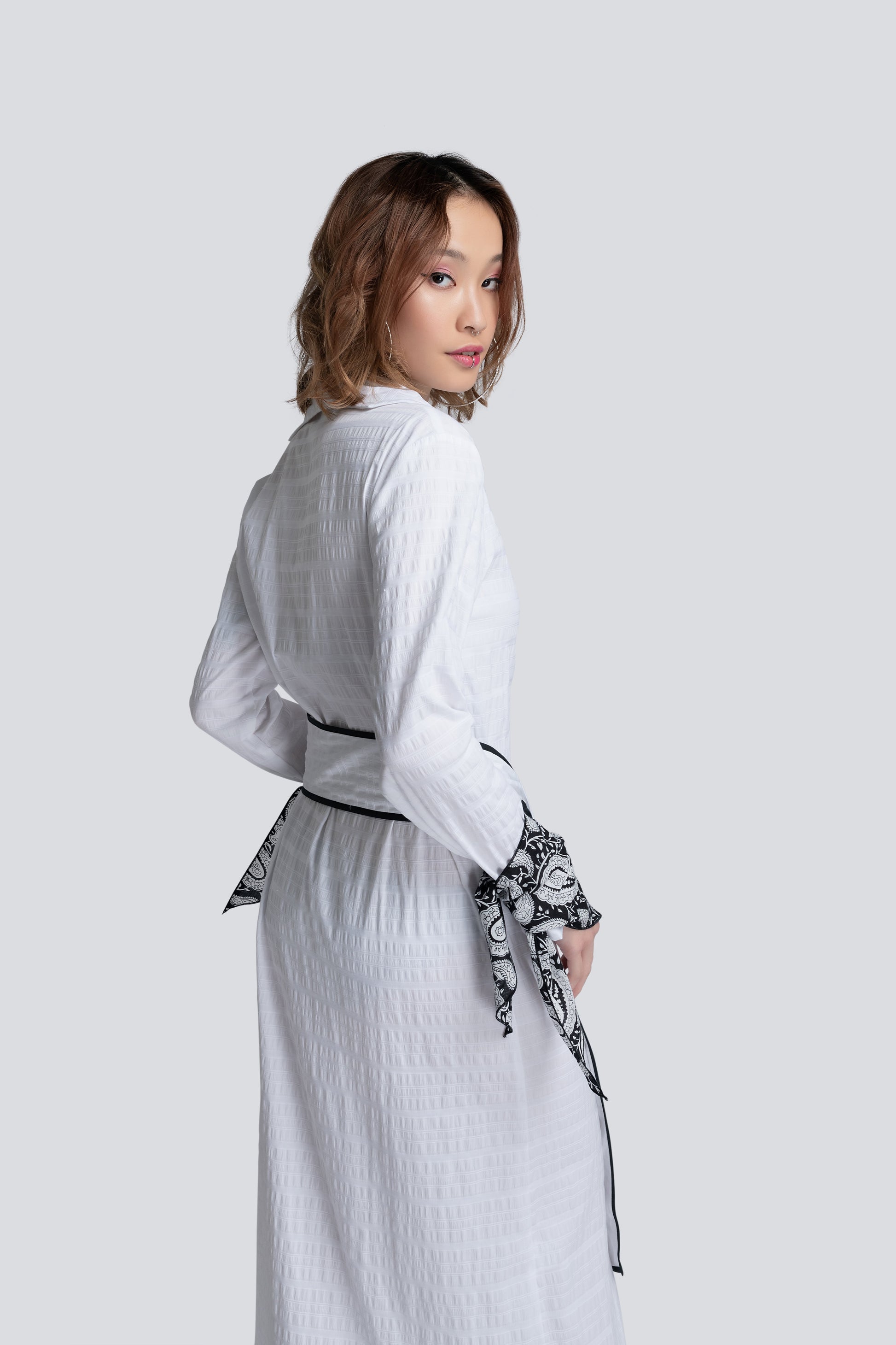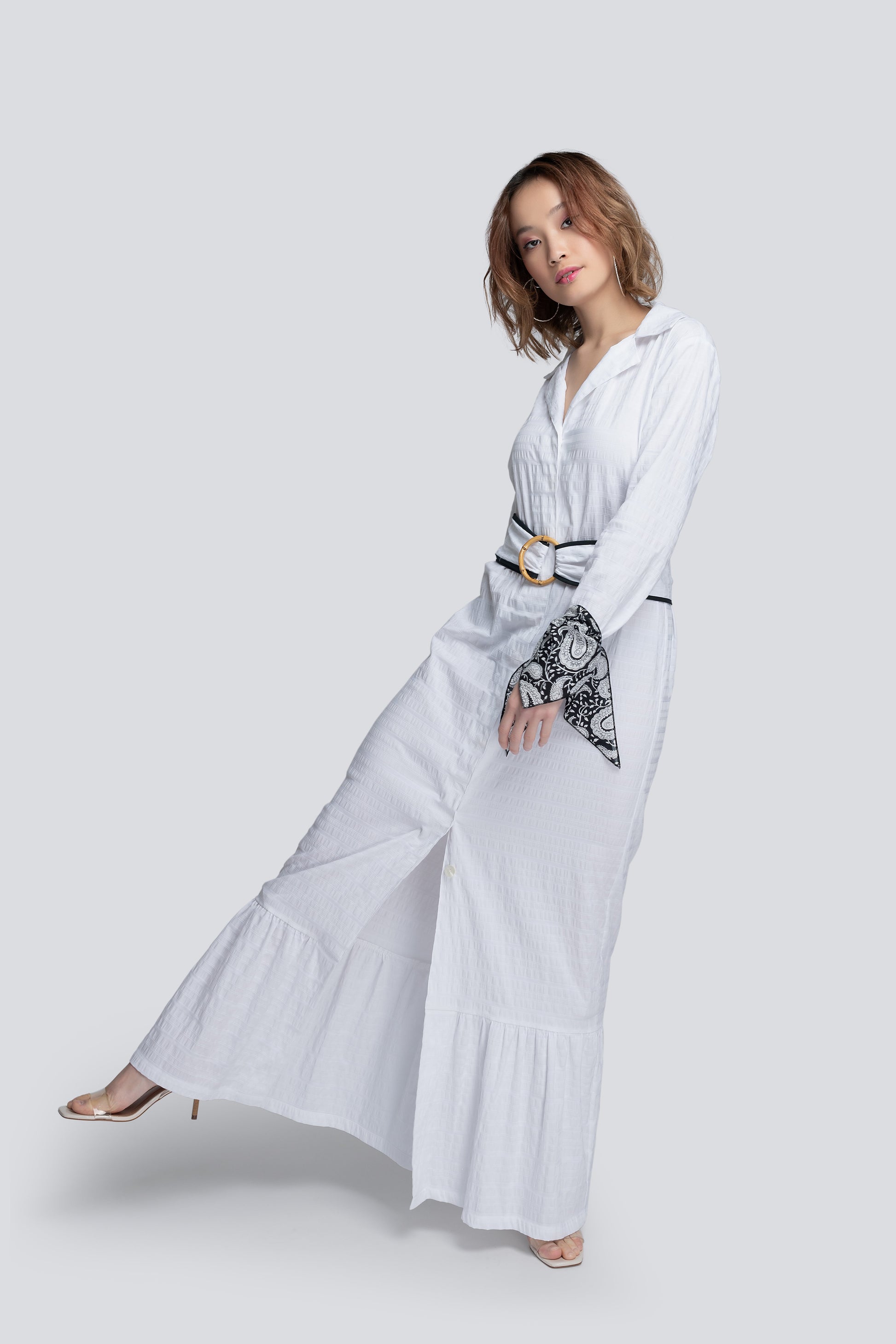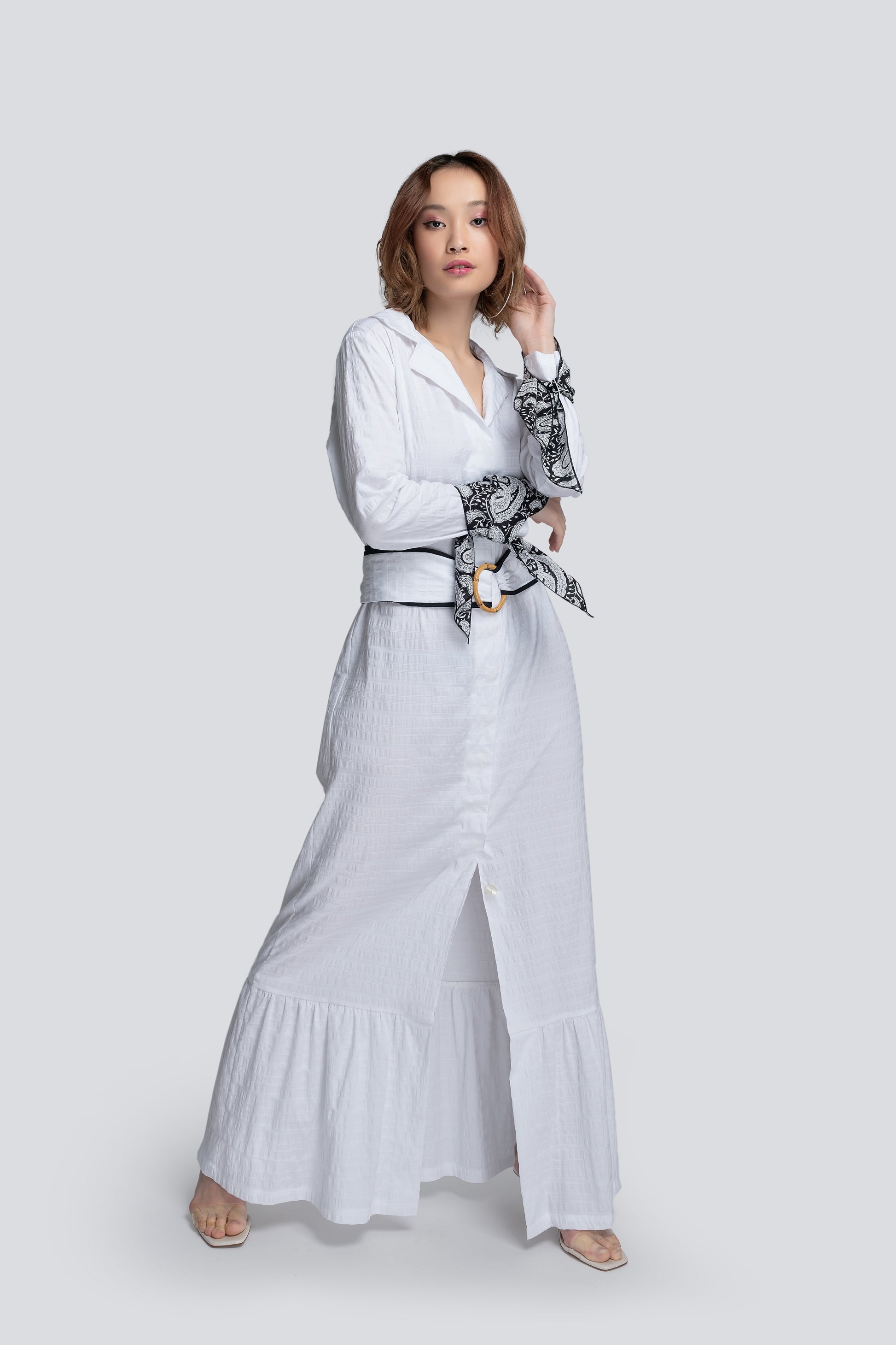 Effortless and versatile, the Jodi Long Shirt Dress has a relaxed fit and fastens with hidden buttons. Featuring a tailored collar and long sleeves with detachable contrasting scarf cuffs. This shirt dress has a ruffled hem for a feminine touch. It comes with a long belt with bamboo ring buckle.