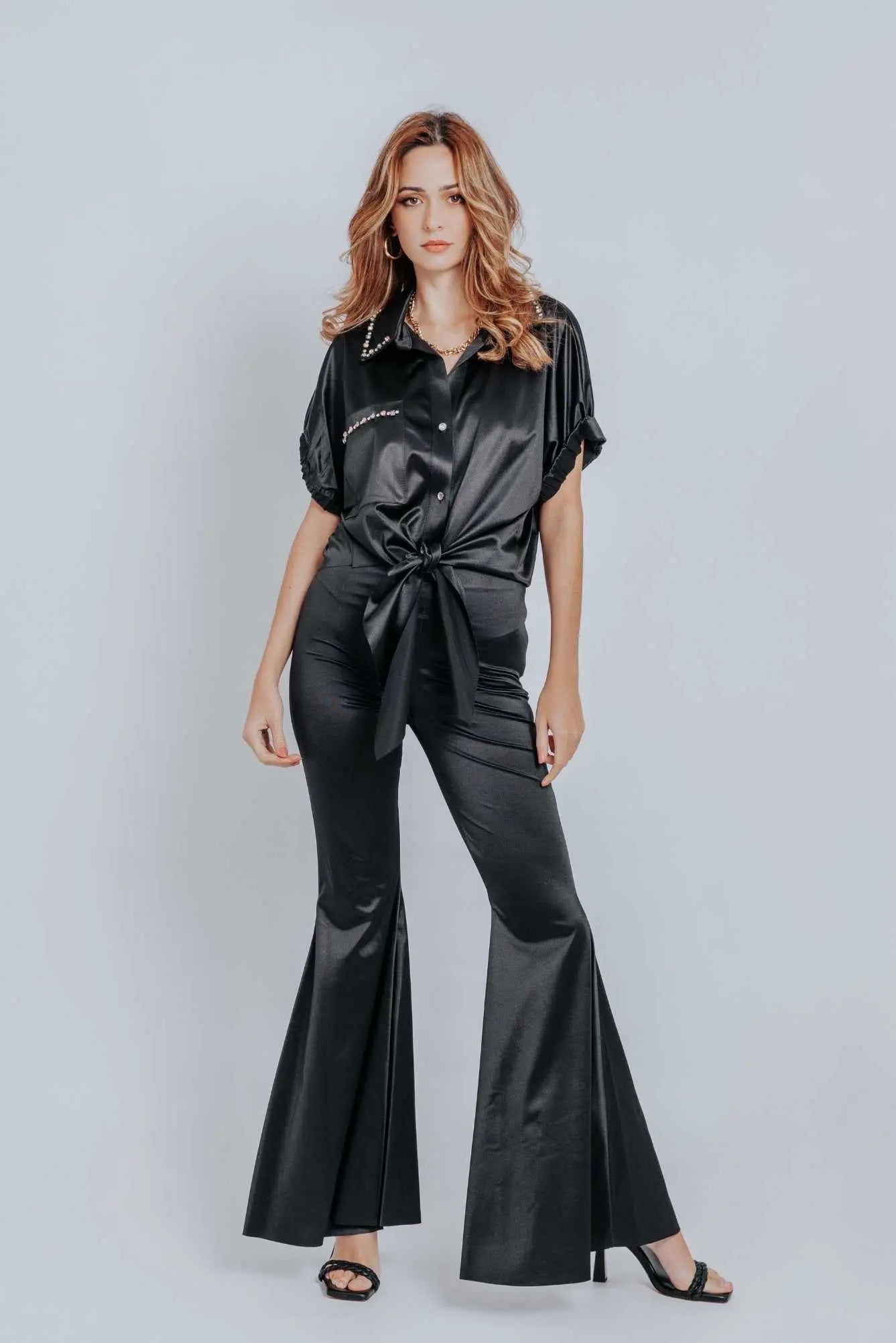 These trendy flare pants can be dressed up or down. They have a high waist, a form-fitting fit, and a black flared leg silhouette. The viscose is extremely soft and stretchy. Style with the matching cropped tank for an effortless look.