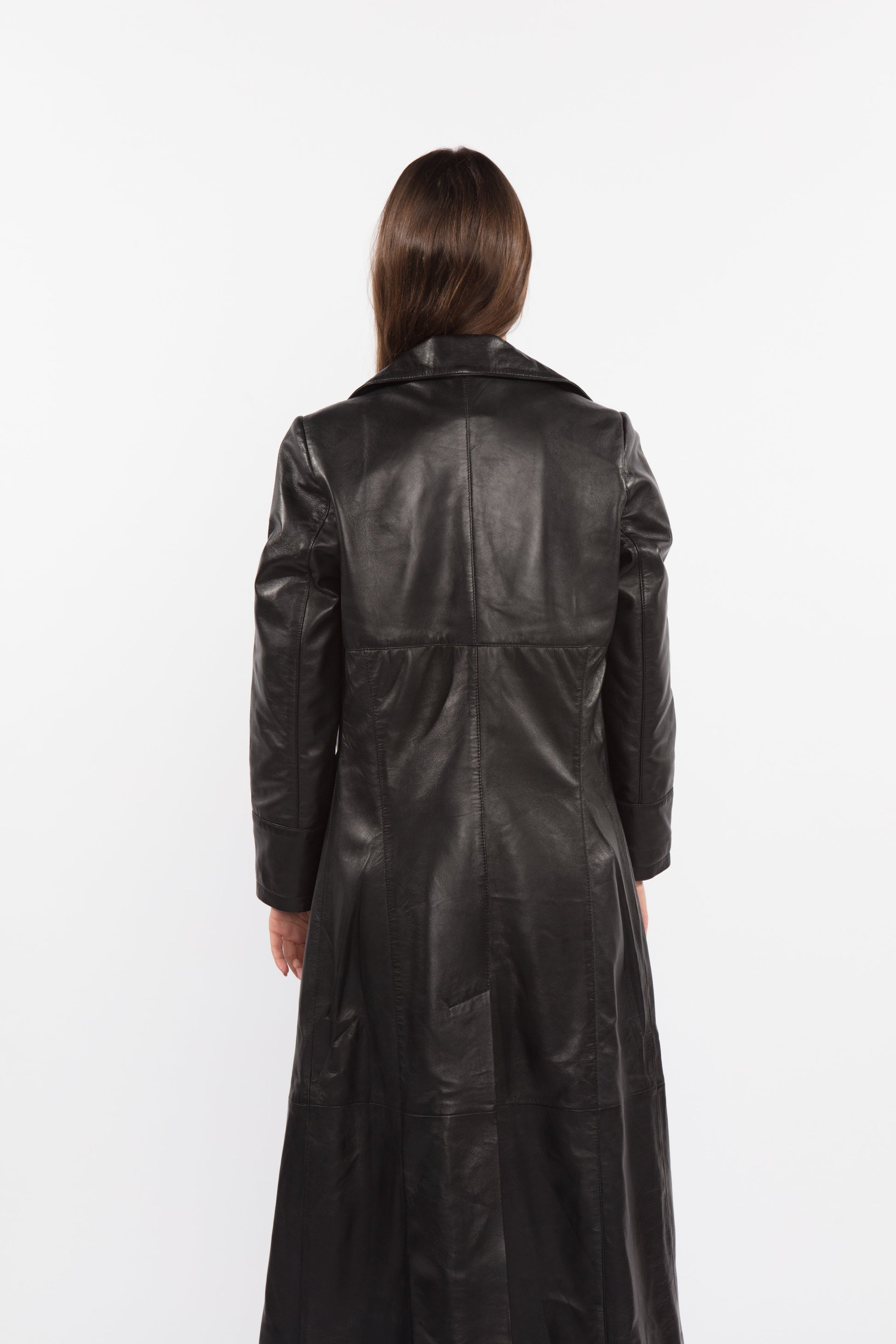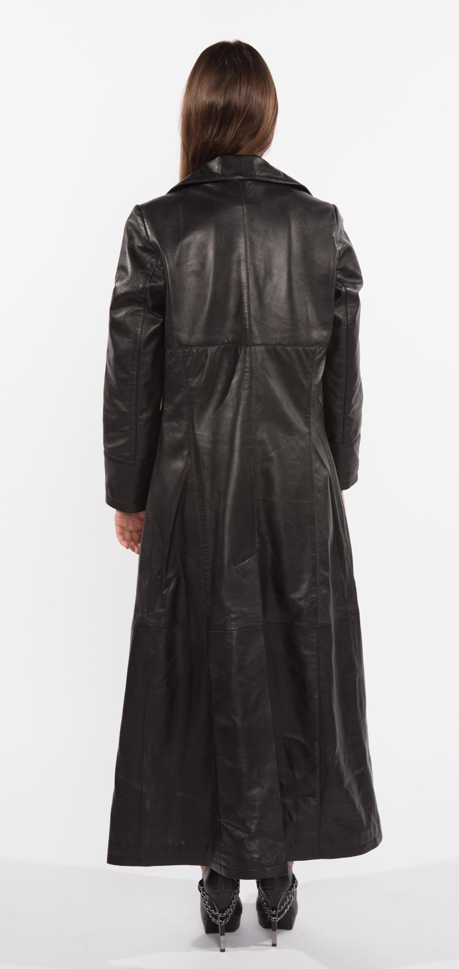 Ladies 3 Button Matrix Black Full Length Leather Coat