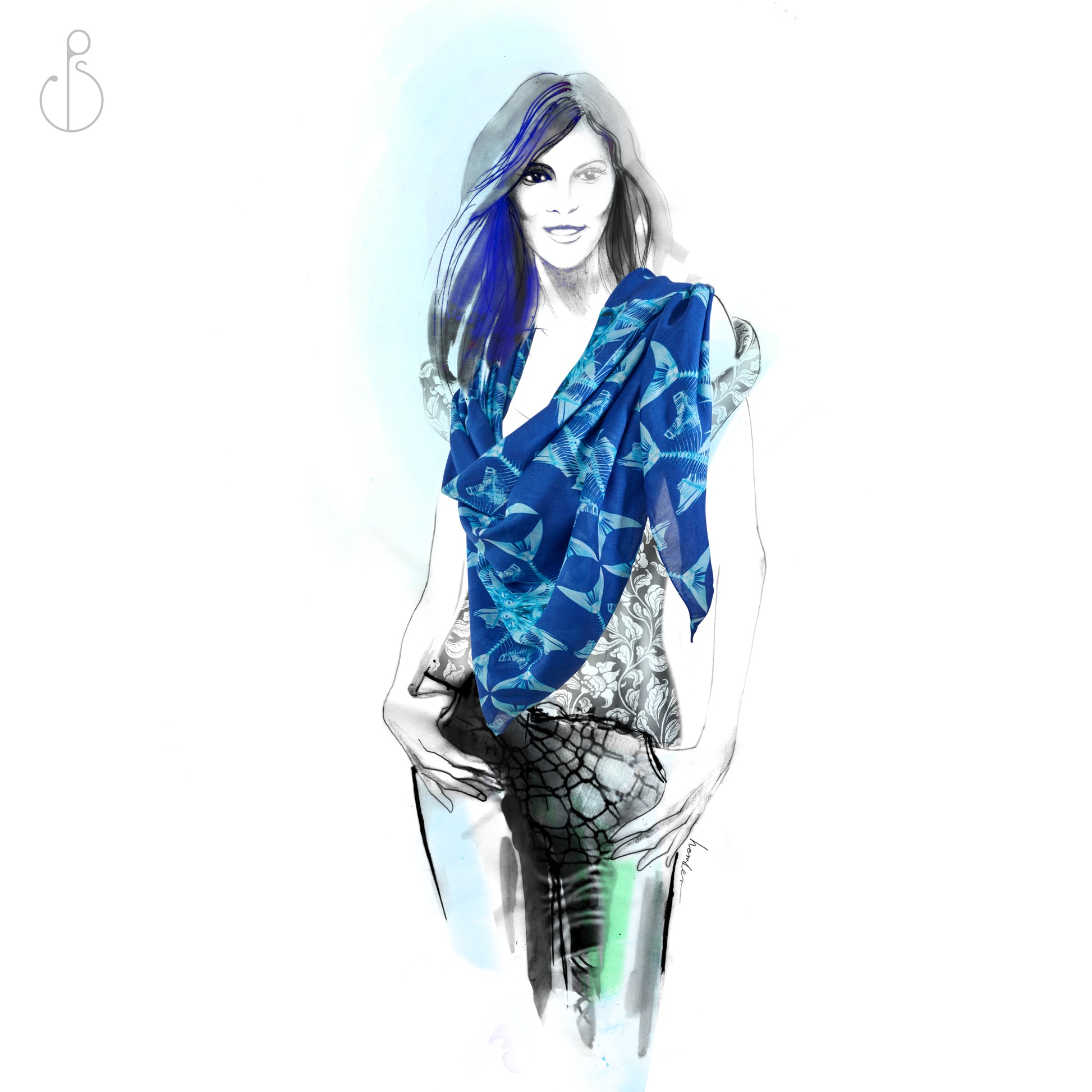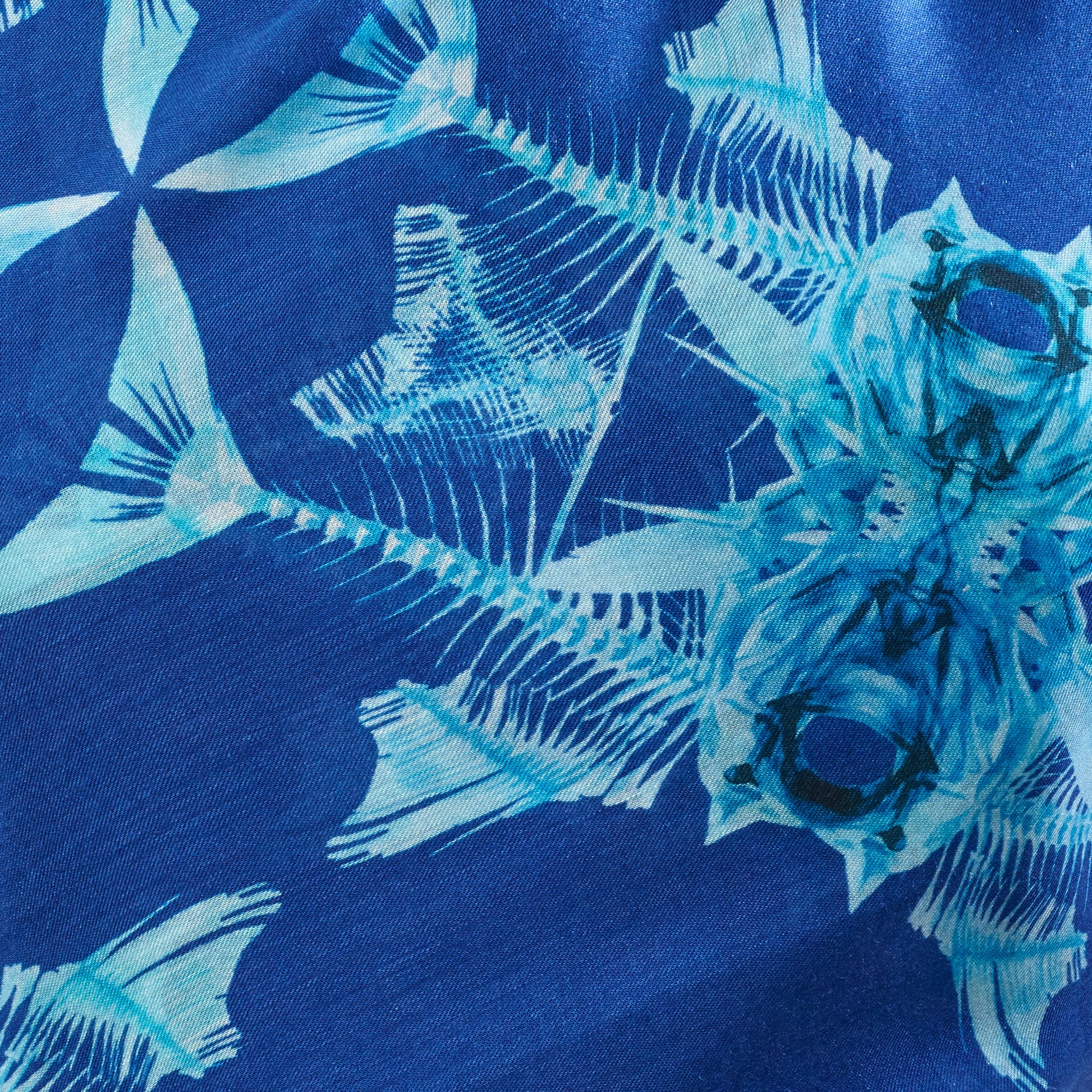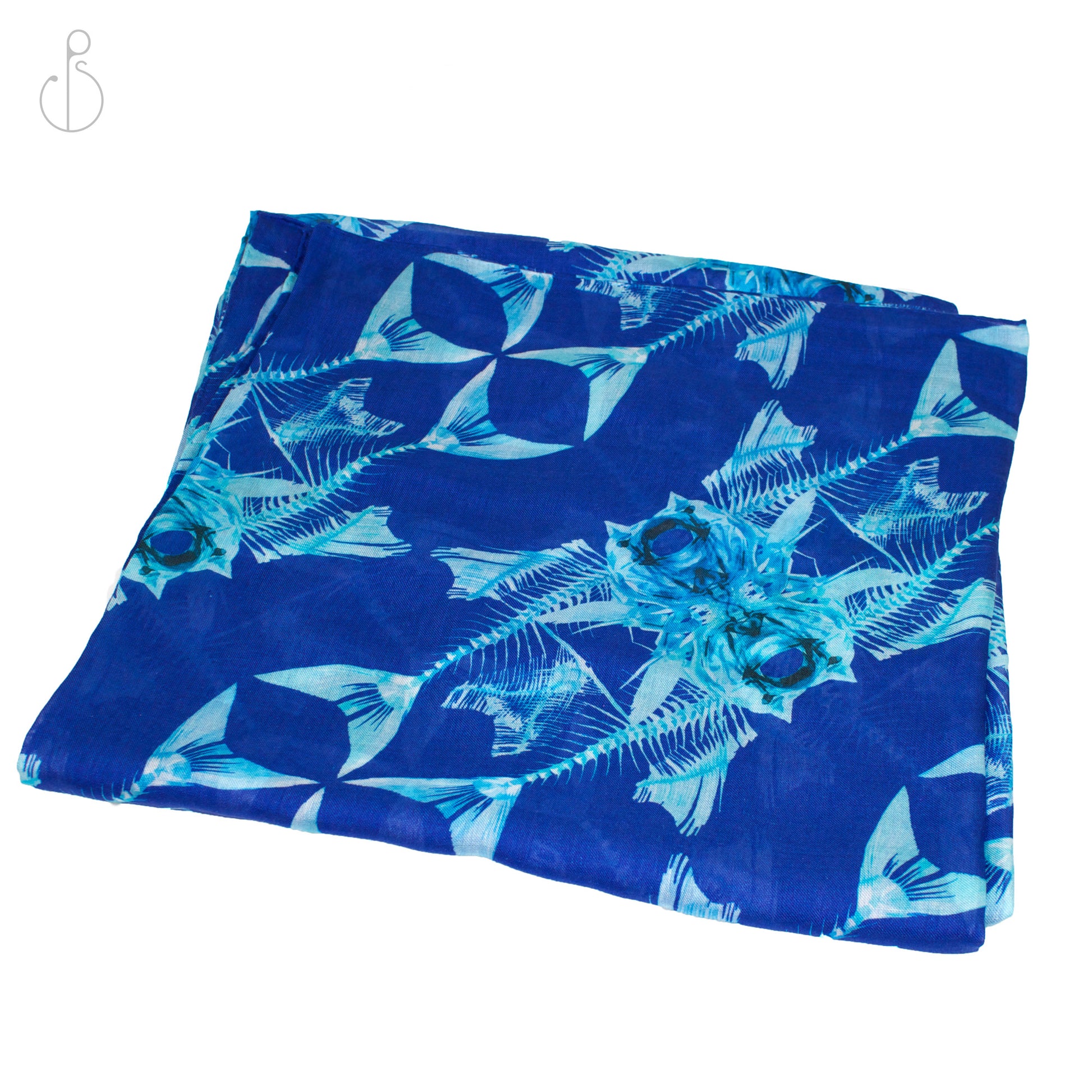 This is not another skeleton scarf. It’s a stylish must-have accessory where fish skeletons take on a fascinating artistic reincarnation. We imagined the stillness of the ocean and its mysterious depths for you, and depicted them in one of the edgiest scarves from our PostMortem collection. Add a vibrant splash of blue to your outfits with this versatile accessory with unique pattern! Besides looking achingly cool you will show your subversive love for the underwater world spreading the message that yes, there is beauty in every creature, even beyond life. Quite a statement, we must say. - 140 x 140 cm – printed on Modal 93% & Cashmere 7% – the edges are hand-rolled – made in Como, Italy – to be delivered within a box The scarves are produced from A to Z in Como, Norther Italy, world’s most qualified district for high quality fashion accessories. Modal is a processed bio-based textile made from reconstituted cellulose from the beech tree. The smoothness of the fabric also makes hard water deposits less likely to adhere to the surface, so it stays soft through repeated washings. Cashmere, is a fiber obtained from Cashmere goats and other types of goat. Cashmere is collected during the spring moulting season when the goats naturally shed their winter coat.