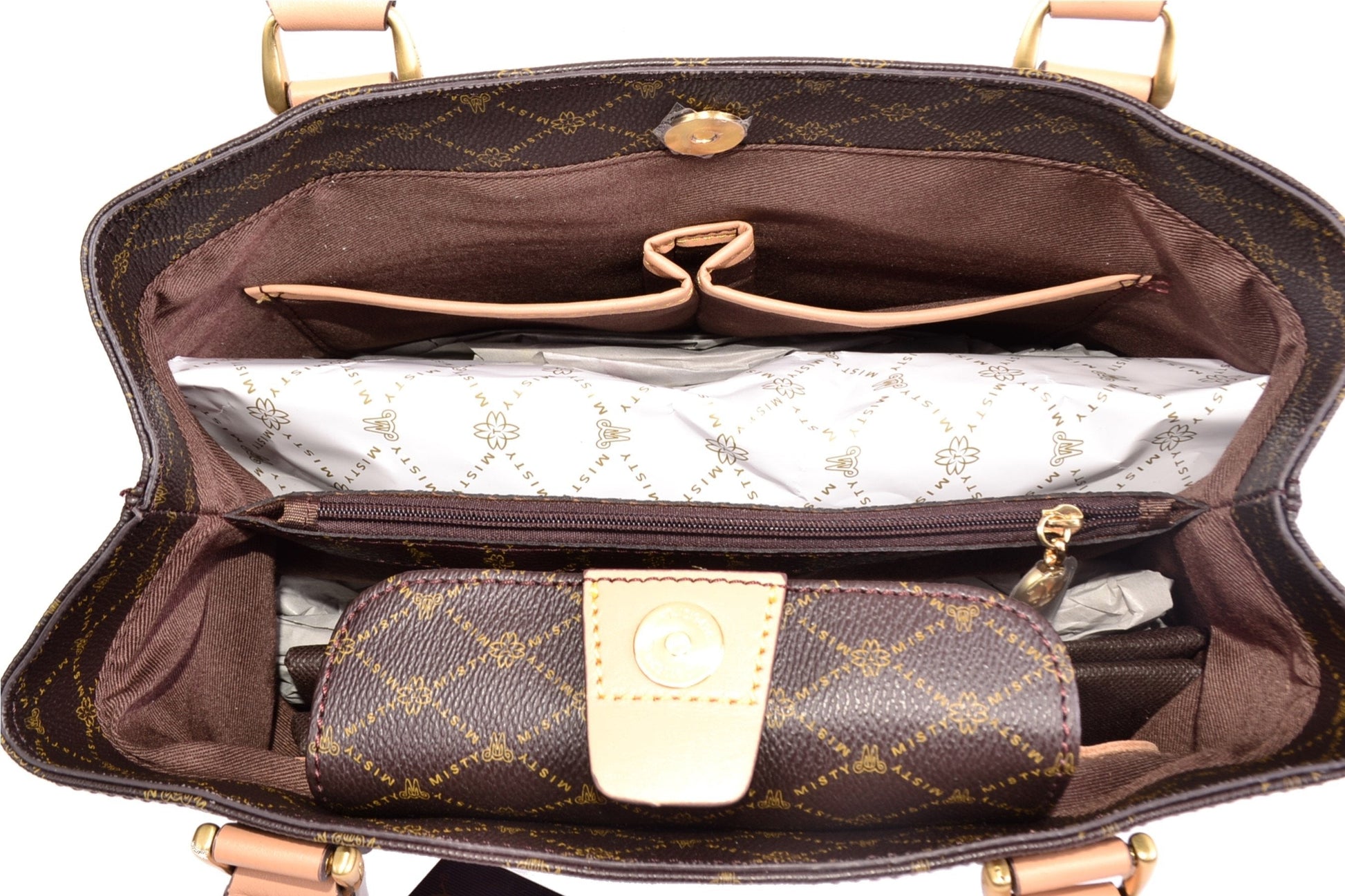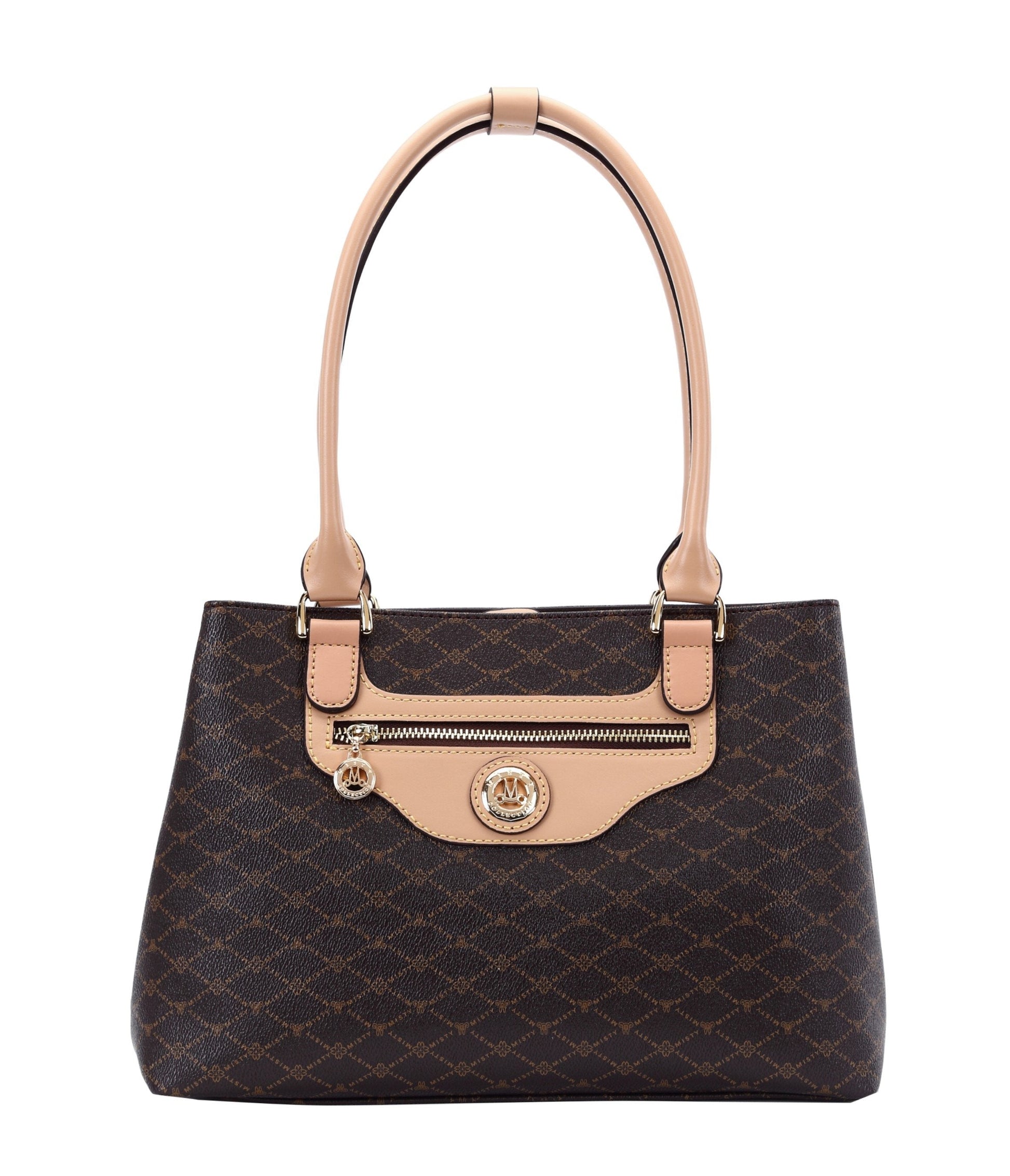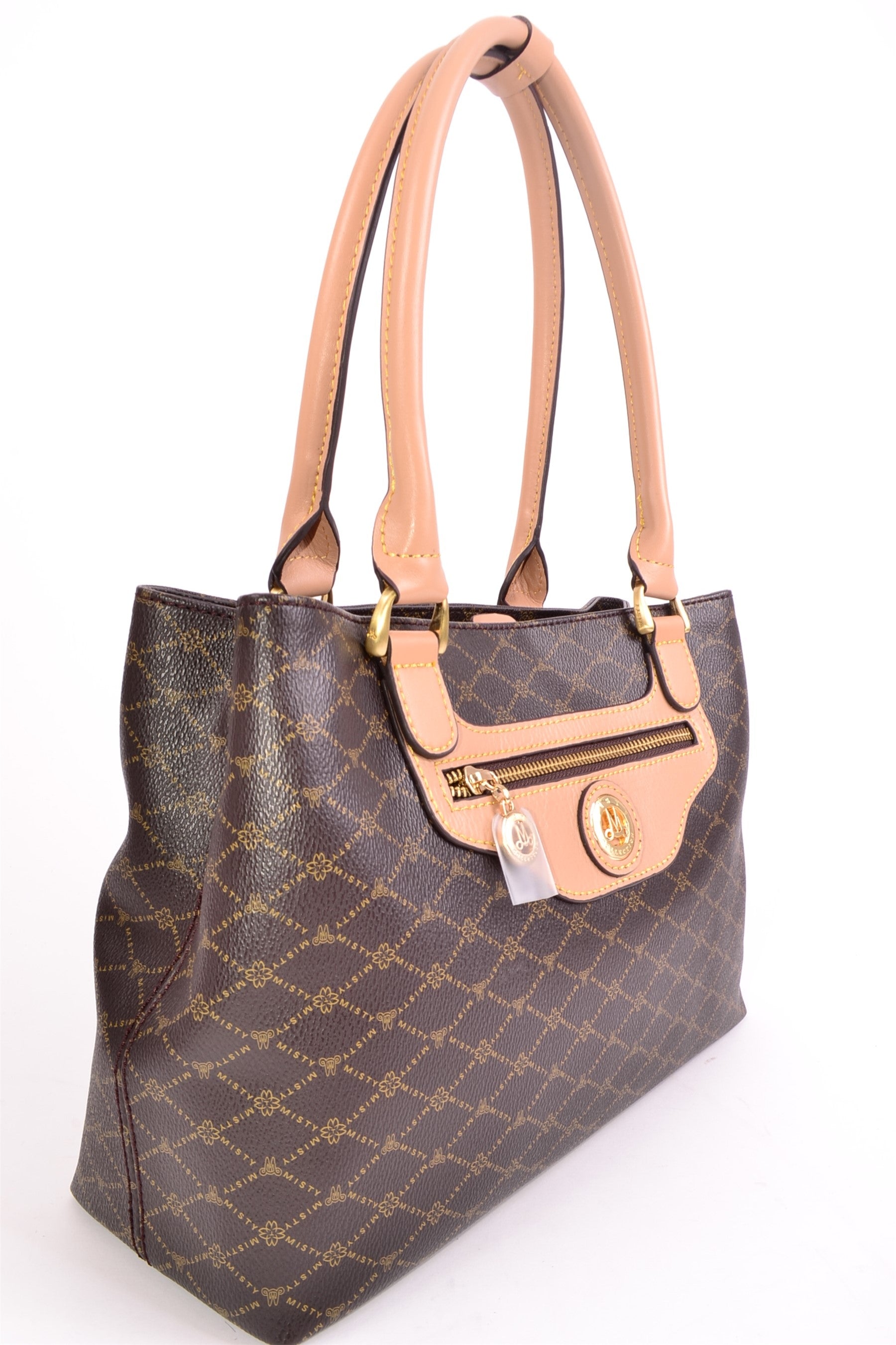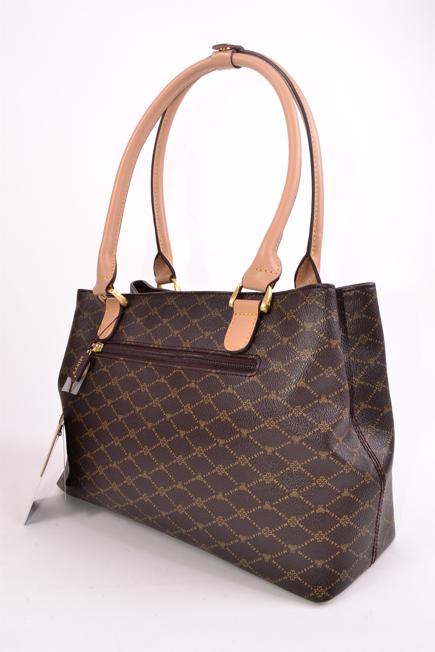 Misty U.S.A. Handbags are made from genuine bonded leather with gold plated accessories. The bag’s perfect convenient size, perforated Monogram pattern, and multi pocket interior make it modern, desirable and trendy. It's leather bag handle enables a hand or elbow carry.