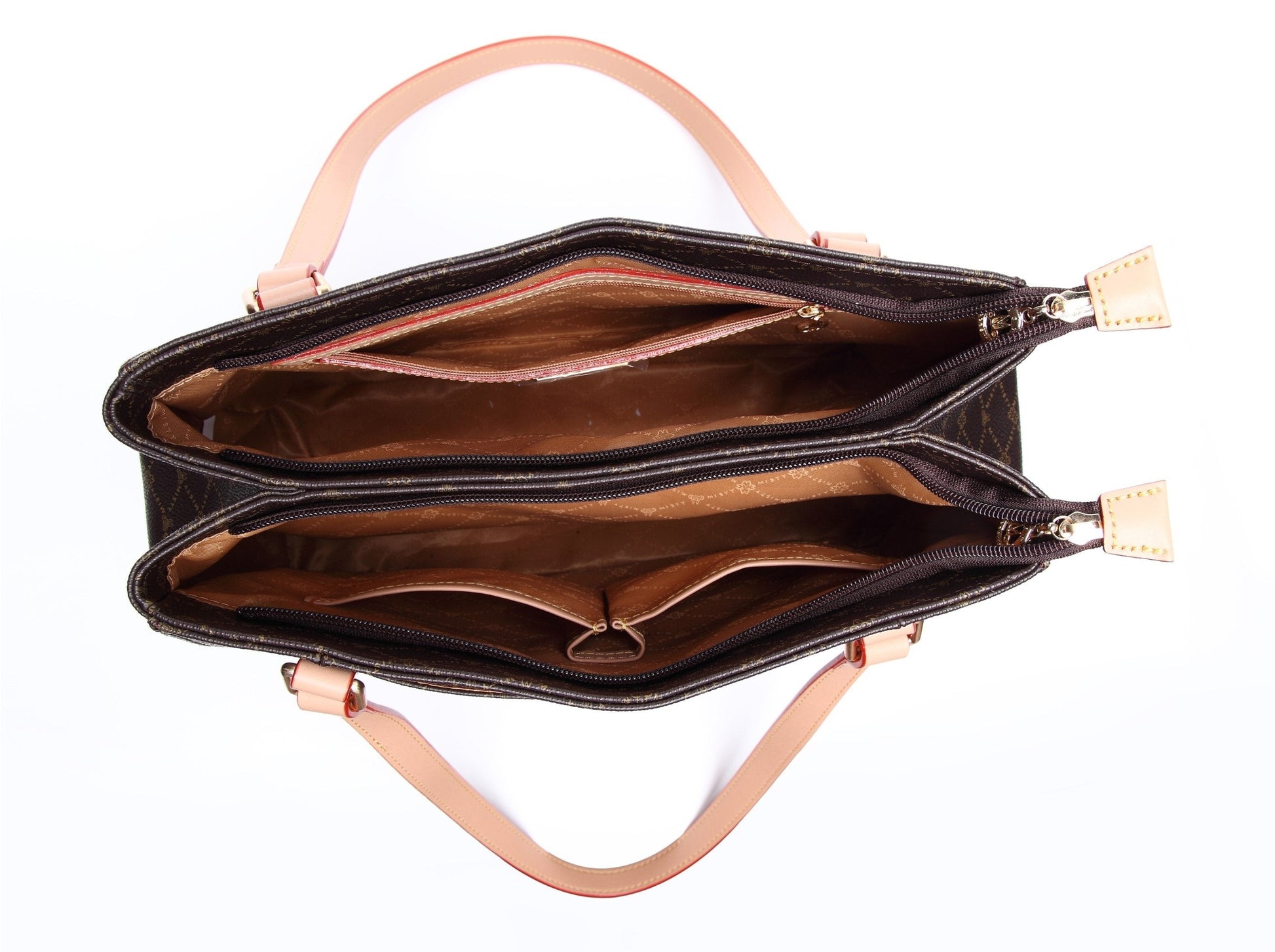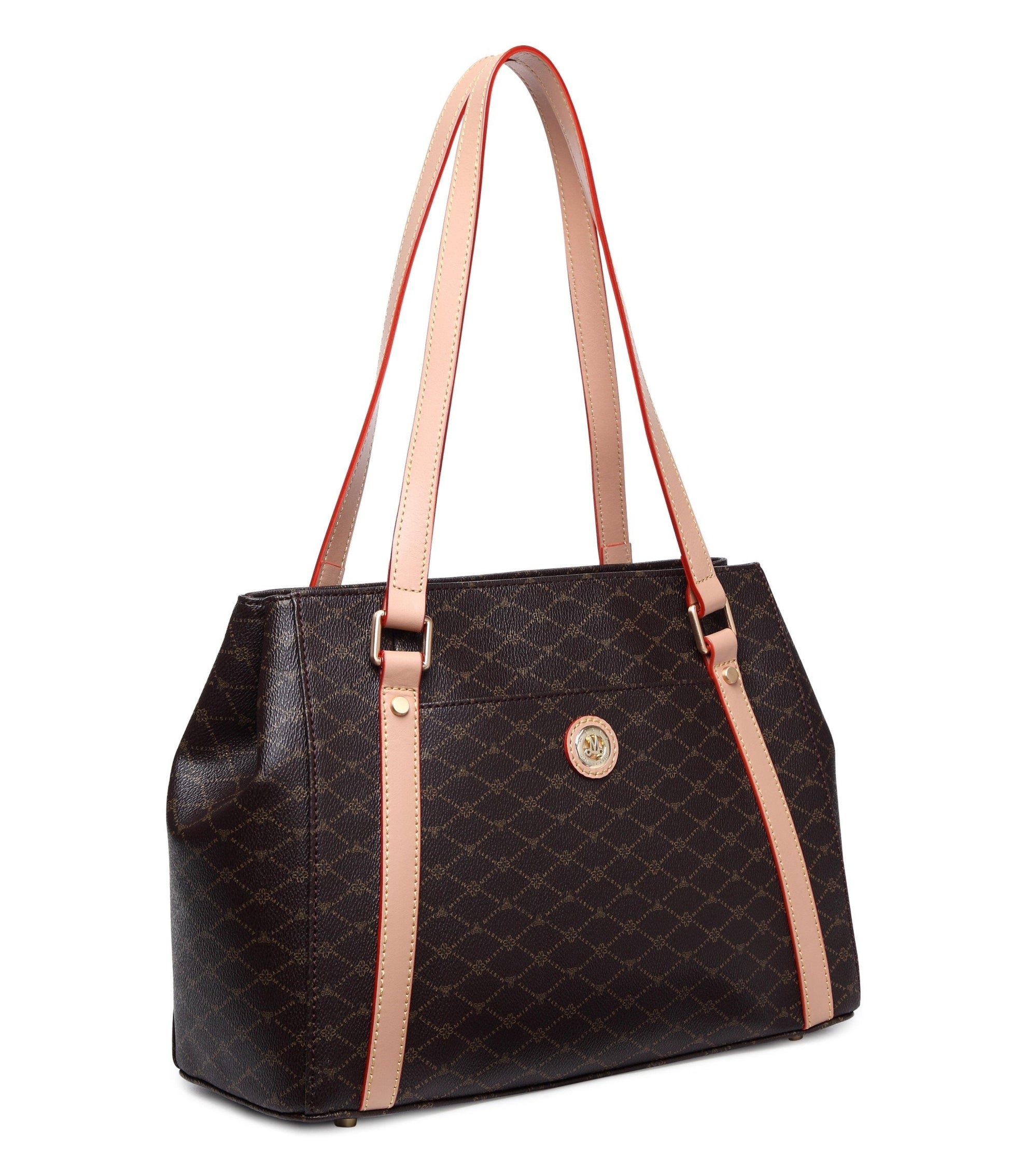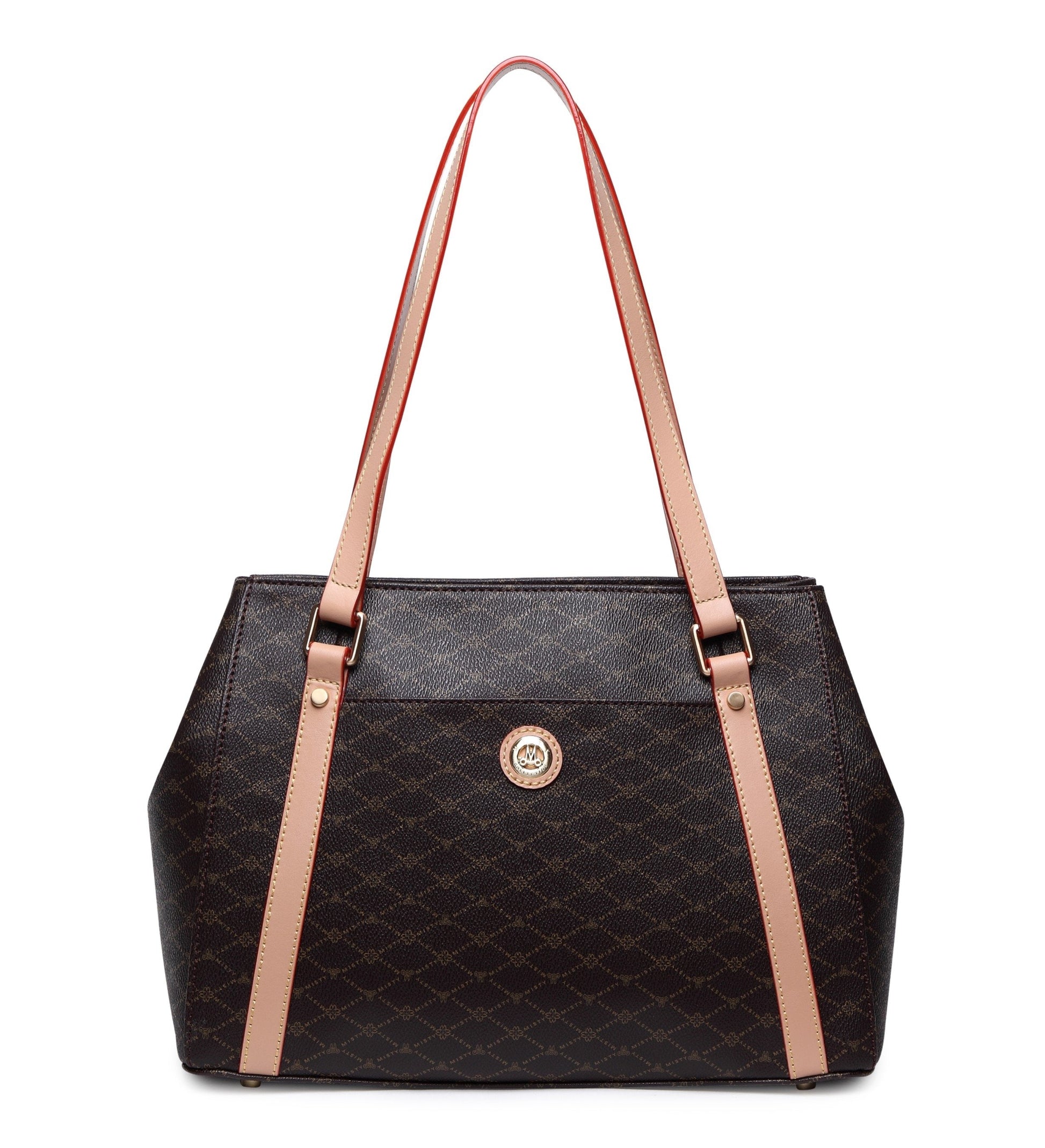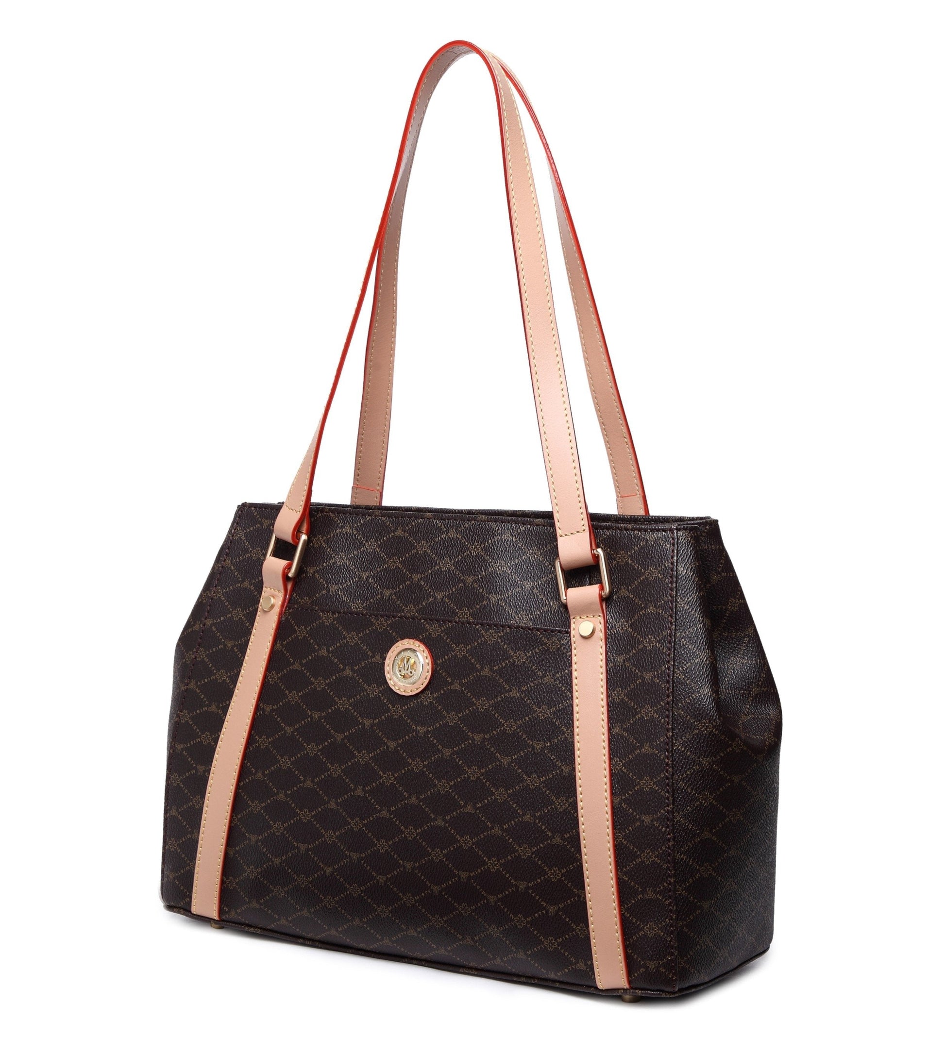 Misty U.S.A. Handbags are made from genuine bonded leather with gold plated accessories. The bag’s perfect convenient size, perforated Monogram pattern, and multi pocket interior make it modern, desirable and trendy. It's leather bag handle enables a hand or elbow carry.