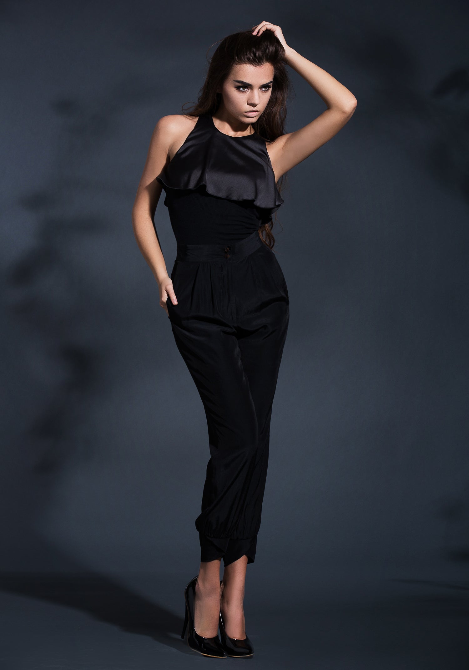 One piece tank top with top layer cropped satin fabric and bottom layer stretchable rib knit; top layer is dark grey/ lead colour whereas bottom layer is black;  hook-and-eye closure at back.