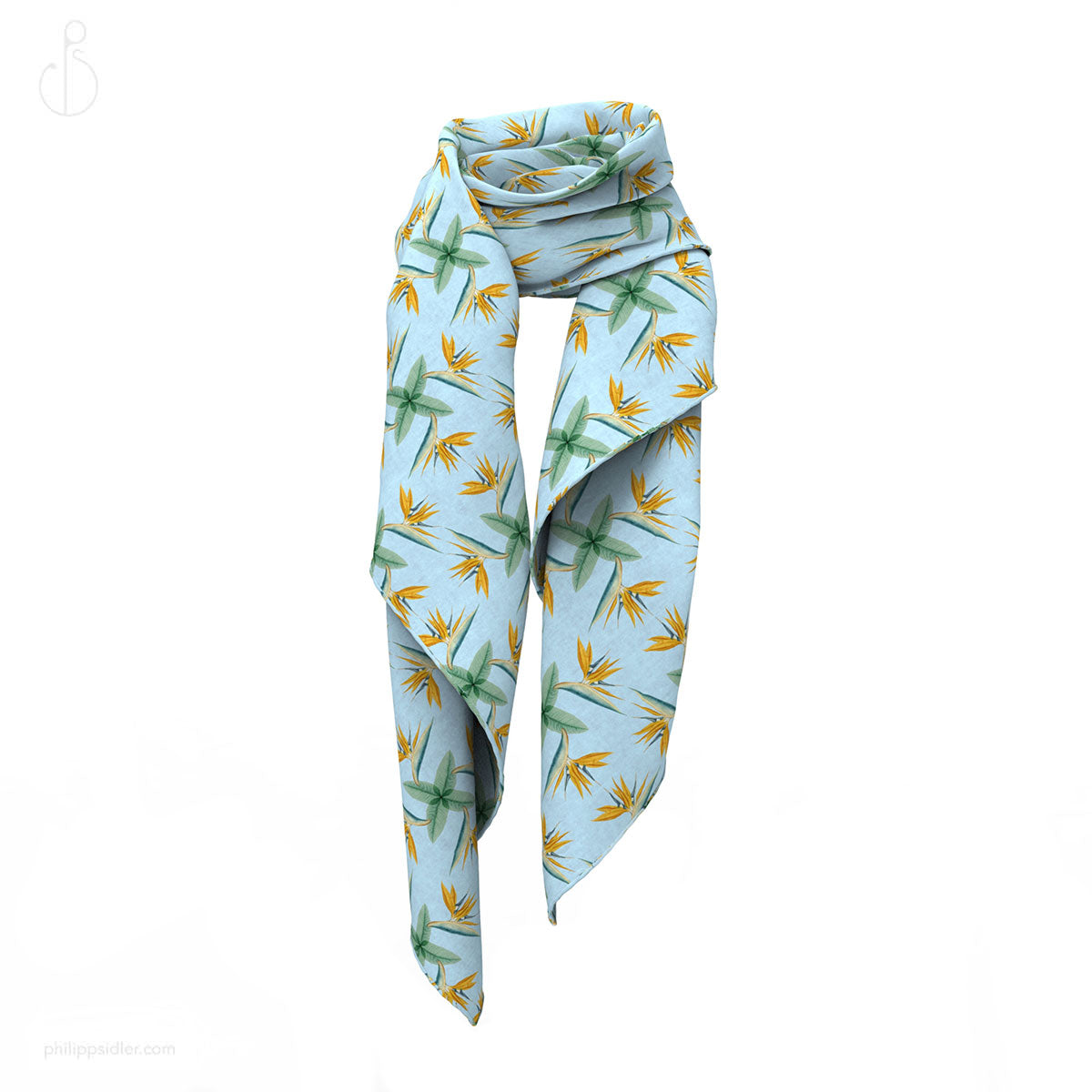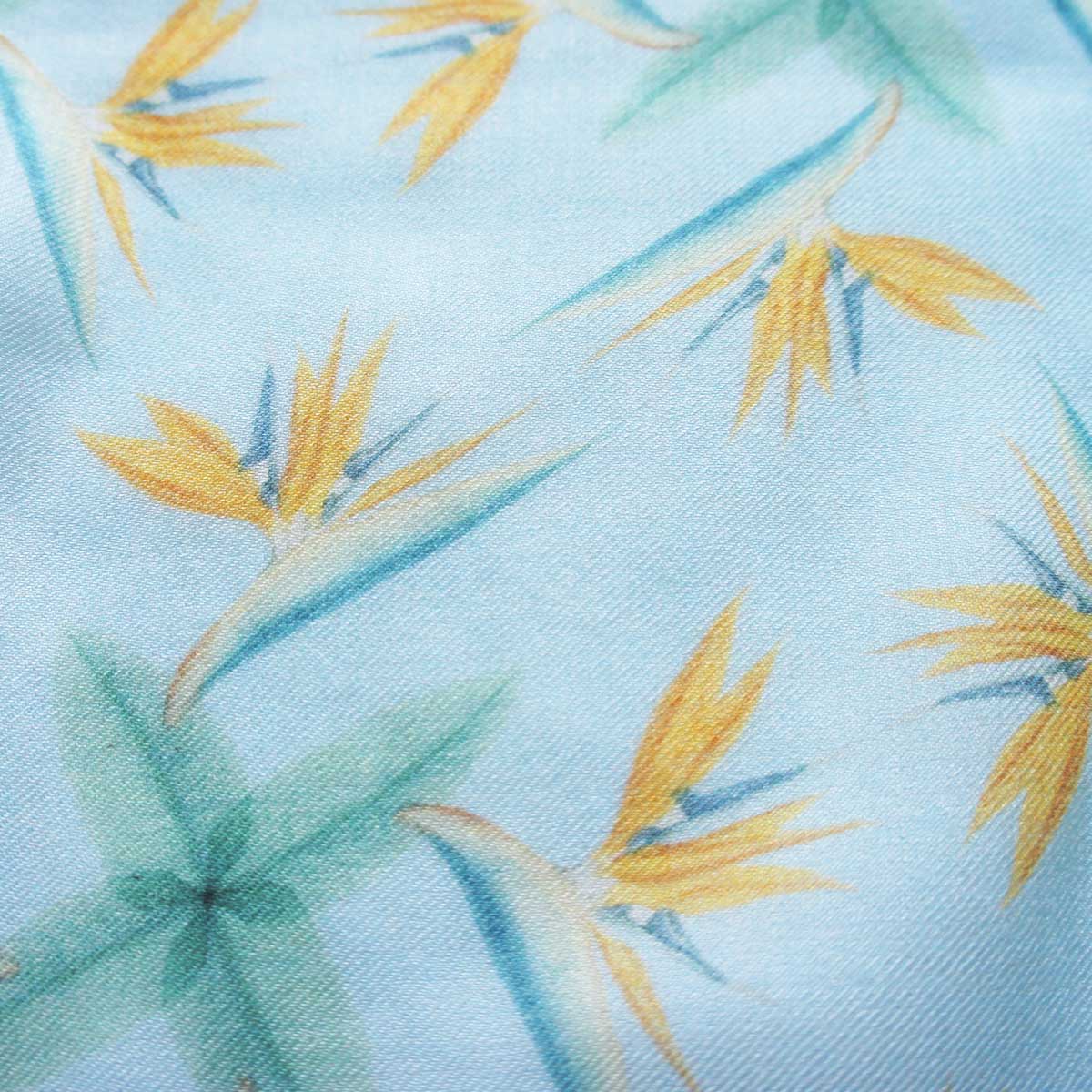 We simply had to design a luxurious light blue scarf with bird of paradise flowers (arranged to resemble colorful colibris) to reveal your exuberant and passionate self. Symbolizing joy and faithfulness, this exotic flower also stands as the ultimate symbol of freedom and paradise. We combined modal and cashmere for a superb scarf that will jazz up even the plainest of outfits, adding a playful vibe to them.