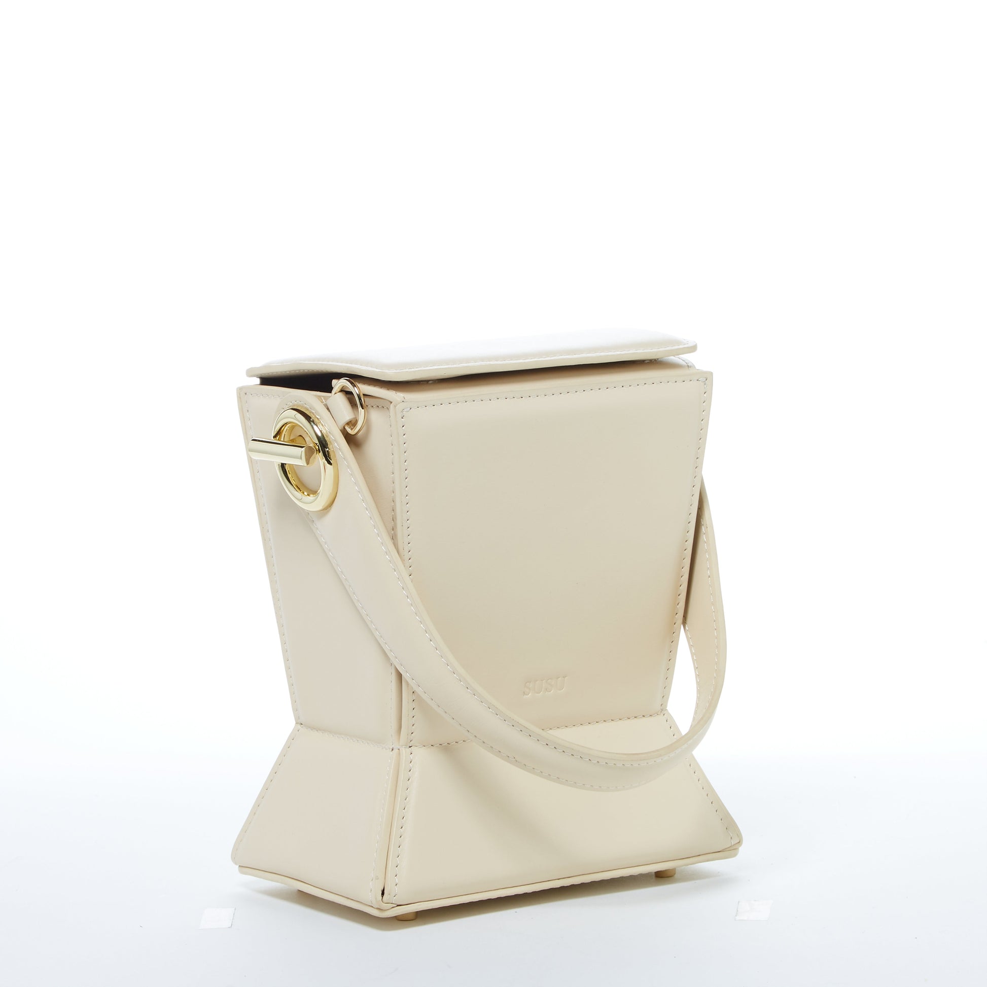 Make heads turn with The Amber, a truly one of a kind off white leather crossbody bag. It’s a must have for anyone that likes to stand out with unique purses. It has a modern geometric design that is complemented with smooth creme-hued leather, light gold hardware, and a coffee cotton lining. The Tower leather bucket bag is more than just eye candy - it has a functional design with a strong double magnetic closure for easy access and folds out into a roomy accordion shape which you'll find a surprisingly spacious interior. It also comes with an adjustable and removable cross over strap, so you can wear it as a cross body purse or carry it by the top handle as a bucket barrel bag. However you decide to style it, this unique vase shape vanilla custard bucket handbag will definitely take your outfit to the next level.
