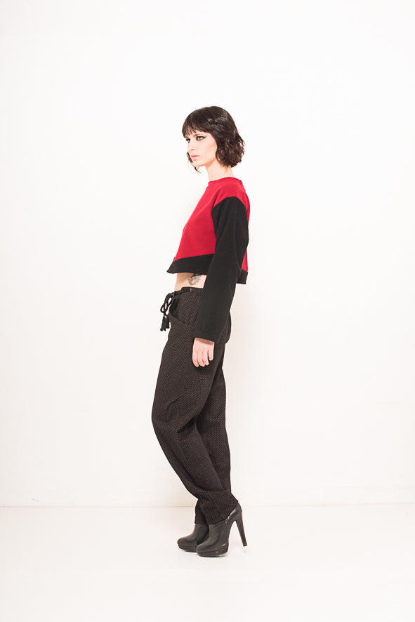 Cropped top with black sleeves and panels and a slit in the back.